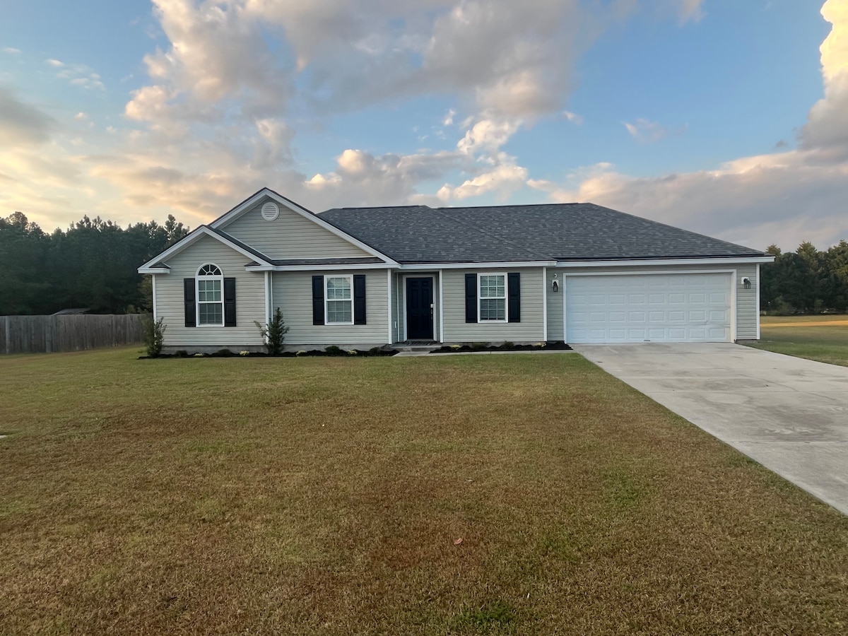 Cozy and secluded 3 bedroom, 2 1/2 bath home in Southeast Georgia; suited for a family or Couples getaway, Weekend visit with your GSU student, Vacation, wedding or romantic getaway. Graced with a large 5 acre private yard, come and relax, escape city life and enjoy nature. As night falls, soak up the stars while enjoying the large outdoor fireplace while relaxing in hammocks and swings. Total of 8 Guest Occupancy-Maximum this includes Children & pet! 15 mins from Georgia Southern University