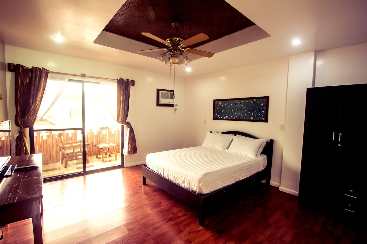 This is a DOT ACCREDITED beach front bedroom is tastefully furnished with local art and is equipped with conventional conveniences, such as an air-conditioner, hot and cold showers, and a flat-screen TV. The inviting queen bed is dressed in clean, white linen and has minimalist side tables on both sides. The flat features a balcony that offers excellent views of Bulabog Beach. Station 2 White Beach is less than 10 minutes walk only .