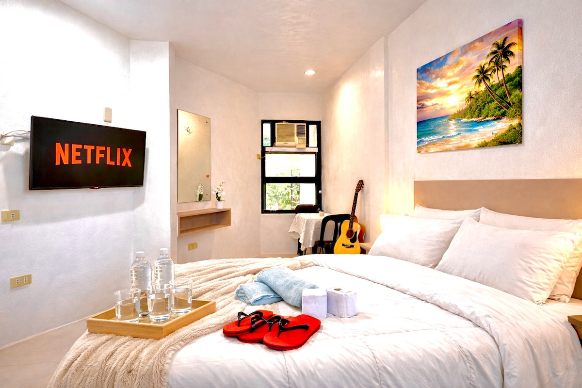 Discover your own slice of paradise in this stylish and comfortable 1BR apartment just steps from the breathtaking Bulabog beach! With a fully equipped kitchen, open-plan living space, and a luxurious King bed, you'll have everything you need for a very comfortable holiday. You'll be just a short 10 minute away from the bustling D Mall area and the world-renowned White Beach.