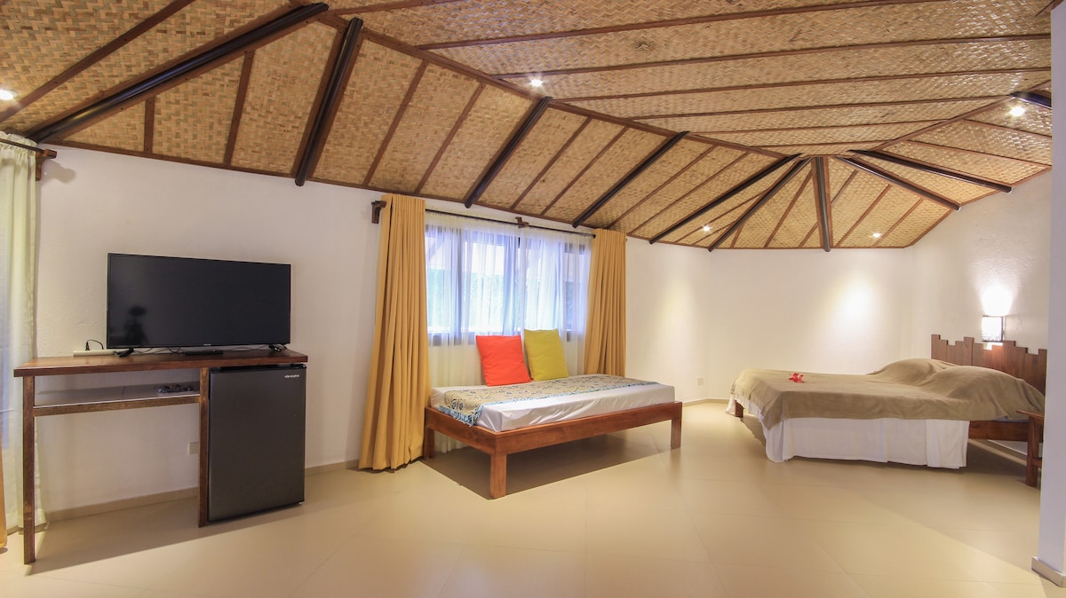 The bright room with terrace overlooks a tropical garden. You may enjoy the ocean and horizon with sunset from our garden roof deck with a romantic dinner. Pristine beaches are minutes from our location. The booking includes complimentary breakfast. Local dishes and seafood dinners are prepared by our Chef upon request . You may expect a unique island experience in our sustainable boutique property with just 9 rooms/apartments. We operate a backup generator.