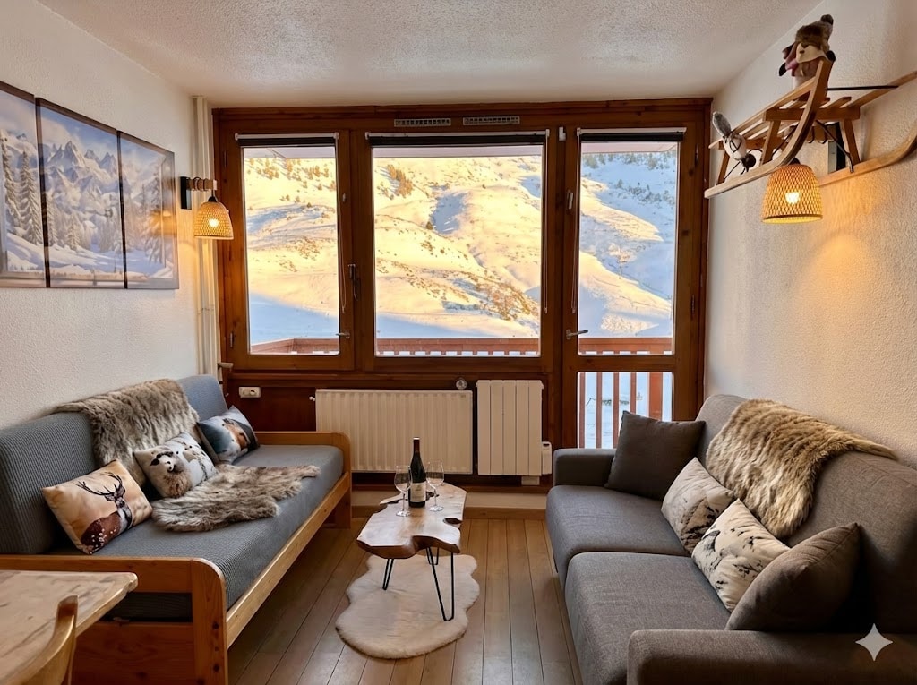 Appartement situé à 1830 m d altitude, départ et retour logement à ski:télésiège et téléski au pied de la résidence. logement classé meublé de tourisme 2 étoiles. Coin nuit indépendant, séparé de la pièce de vie. Salle d eau et WC séparés. Cellier/local skis sur le même palier face à l appartement. Cuisine ouverte sur le séjour Balcon exposé plein sud pour profiter de l'ensoleillement et de la vue unique sur les montagnes et le domaineskiable.(table de jardin et chaises à disposition)