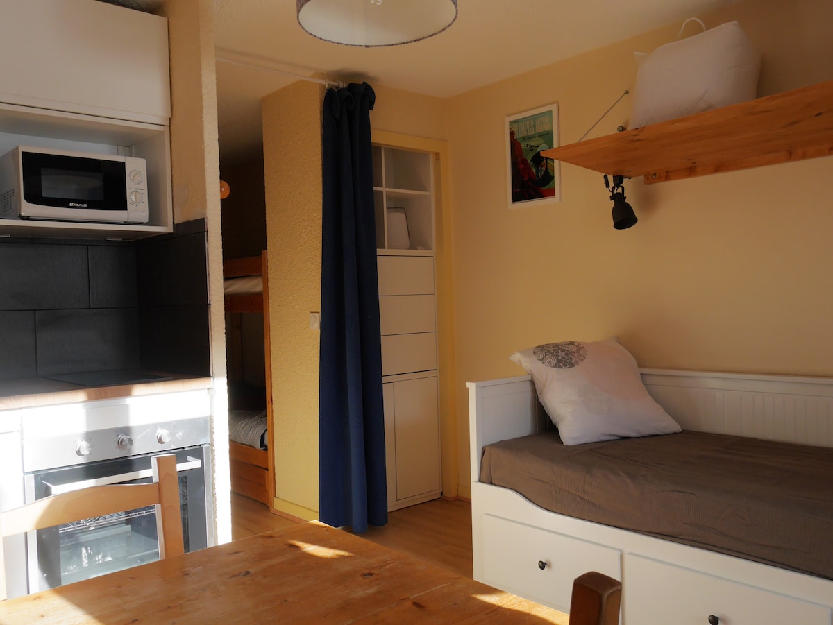 Joli studio refait à neuf avec terrasse En rez de chaussé (sur-élevé) avec terrasse privée et vue sur les pistes. Casier à ski en sous sol, idéal pour une famille de 2 adultes et 2 enfants. Au pied des pistes, des remontées mécaniques, des caisses et du télésiège "La blâche". Parking gratuit, commerces, restaurants et locations de matériel dans la copropriété Linges de lit et serviettes non fournis Attention : Le lit escamotable ne convient pas à un adulte de plus de 60kg.