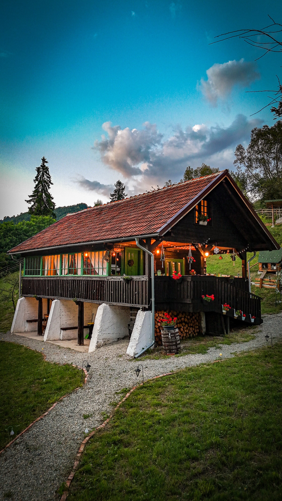 Căbănuța este situată într-o zonă liniștită, izolată în natură, la 5 minute distanță de locul unde vă puteți lăsa mașina. În zona parcării se afla un teren de tenis, măsuțe cu butuci, o filigorie spațioasă pentru servit masa și un spațiu amenajat de făcut grătar. Bucătăria si cafetiera, toaleta cu duș se află de asemenea tot aici. In zona căbănuțelor aveți o toaletă rustică de lemn și un izvor.