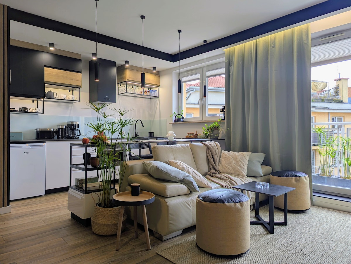 AmSuites - Discover a unique blend of luxury, comfort, and design in this stylish city apartment - perfect for a romantic escape, remote work, or a relaxing city break. ✨ Highlights: - 🧖♂️ Year-round heated Jacuzzi on a 55m² private rooftop terrace - 📺 55” Smart TV - ❄️ Air conditioning, high-speed Wi-Fi & full kitchen - 🚗 Secure garage parking included Soak under the stars, unwind in serene comfort, and make your Warsaw stay unforgettable.