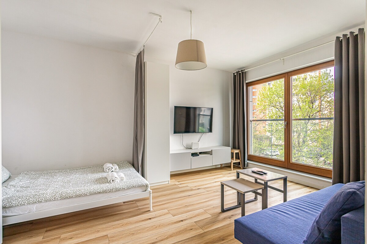 Komfortowy, w pełni wyposażony apartament w nowym budynku. Salon z otwartą kuchnią podzielony na część jadalną i wypoczynkową. W sypialni znajduje się duże łóżko i przestronna szafa. Jest także garderoba jako dodatkowe miejsce do przechowywania. W okolicy znajdują się sklepy, restauracje i kawiarnie Wyposażenie: klimatyzacja, ekspres, czajnik, żelazko, deska do prasowania, pralka Dojazd z Lotniska Chopina 20 min taxi 50 min komunikacja z Lotniska Modlin 50 min taxi 120 min komunikacja