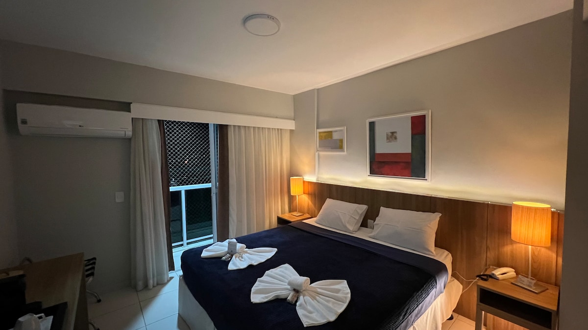 Suíte com vista para montanha em frente ao Riocentro Acomode-se em um espaço moderno, aconchegante e equipado com cama de casal, banheiro privativo, sacada, TV, ar-condicionado, frigobar, micro-ondas e utensílios. O condomínio conta com recepção 24h, Wi-Fi, piscina, academia, spa, mercadinho, restaurante e lavanderia. Localização estratégica: 200m do Riocentro, 5 km do Parque Olímpico, 8 km da Praia do Recreio e 10 km da Barra.