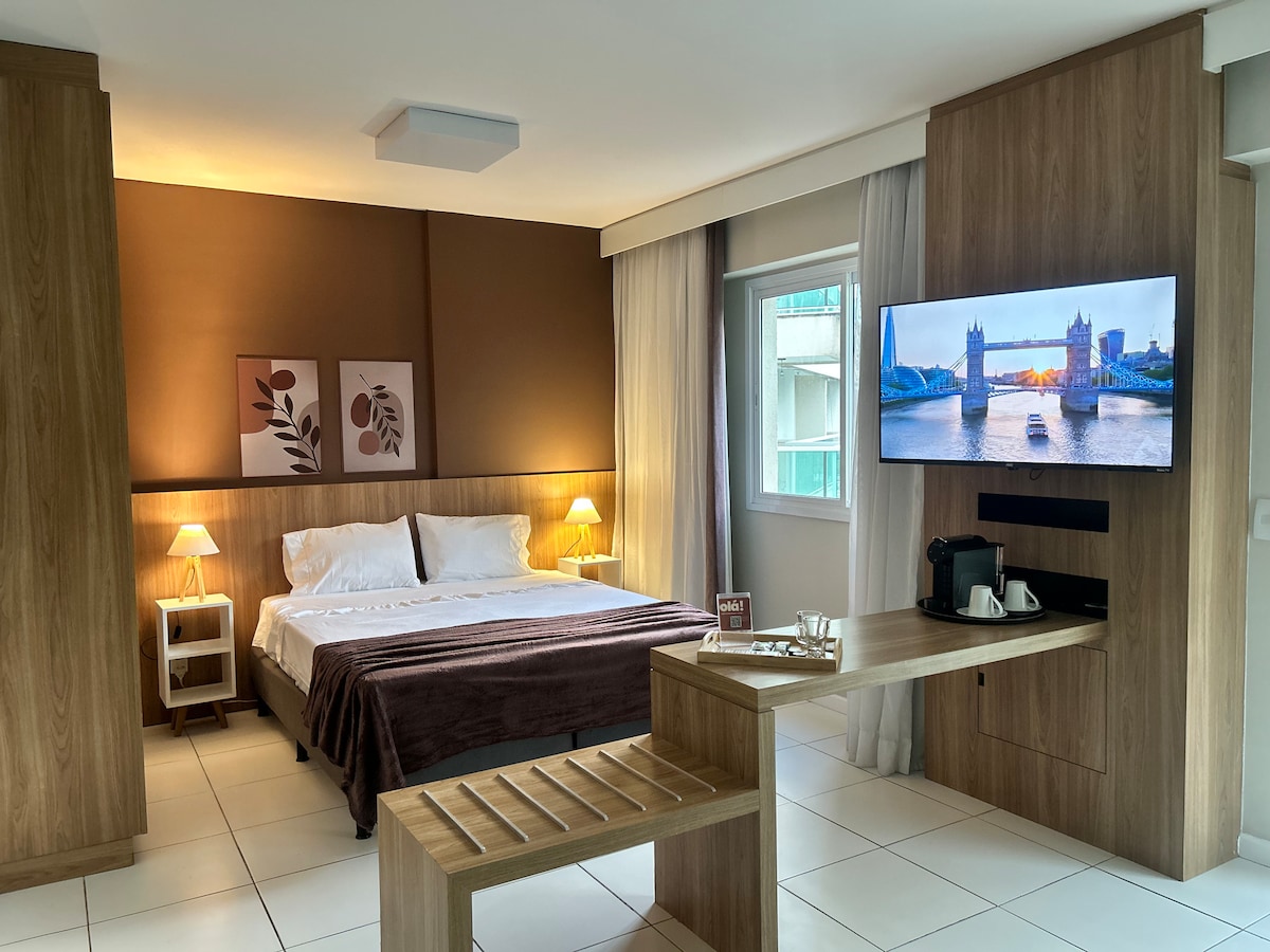 Flat moderno e aconchegante, reunindo o conforto de um hotel com a liberdade de um lar. Ideal tanto para quem viaja a lazer quanto a trabalho, o espaço conta com uma suíte com cama queen, ar-condicionado, Wi-Fi, TV, cozinha e varanda. O condomínio oferece uma excelente infraestrutura: academia, piscina, sauna, jacuzzi e restaurante com preços acessíveis. A localização é privilegiada, a apenas 100 metros do RioCentro, garantindo praticidade e fácil acesso a diversas atrações na Barra da Tijuca.