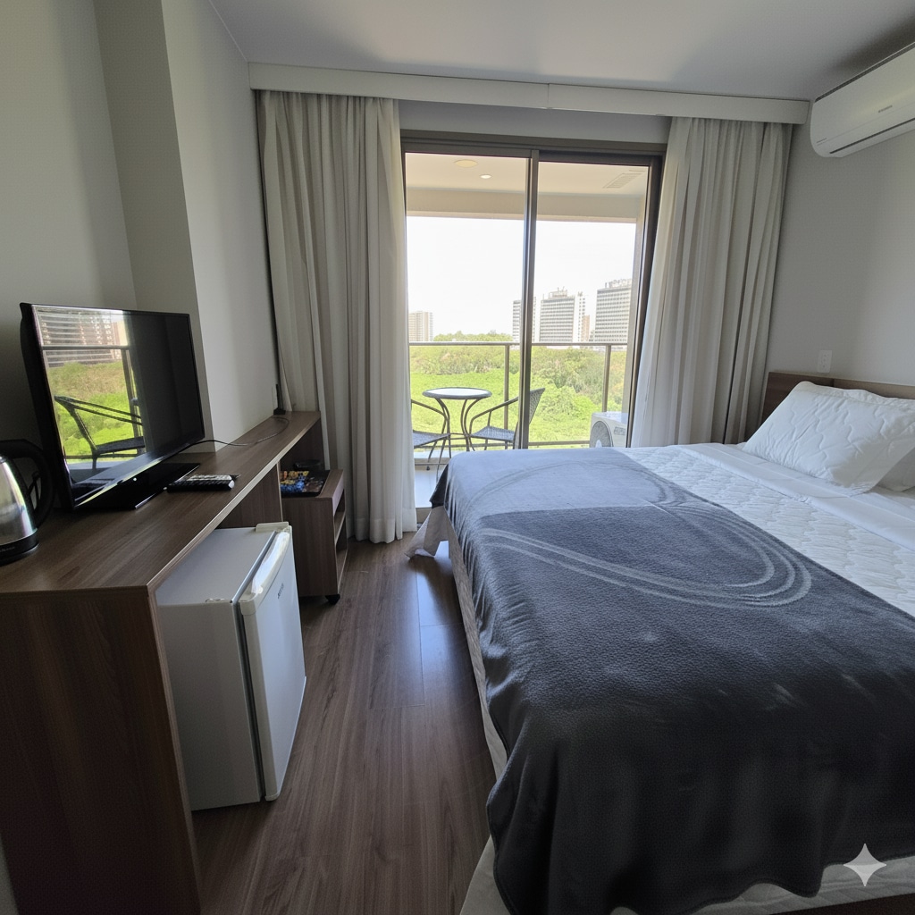 Flat moderno e aconchegante, reunindo o conforto de um hotel com a liberdade de um lar. Ideal tanto para quem viaja a lazer quanto a trabalho, o espaço conta com uma suíte com cama queen, ar-condicionado, Wi-Fi, TV e frigobar. O condomínio oferece uma excelente infraestrutura: academia, piscina, sauna, jacuzzi e restaurante com preços acessíveis. A localização é privilegiada, a apenas 100 metros do RioCentro, garantindo praticidade e fácil acesso a diversas atrações na Barra da Tijuca.