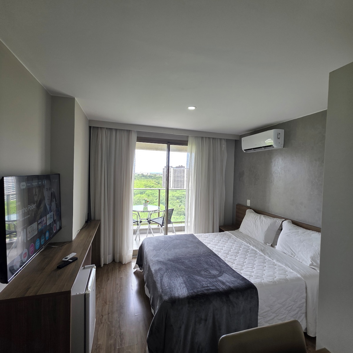 Flat moderno e aconchegante, reunindo o conforto de um hotel com a liberdade de um lar. Ideal tanto para quem viaja a lazer quanto a trabalho, o espaço conta com uma suíte com cama queen, ar-condicionado, Wi-Fi, TV, cozinha e varanda. O condomínio oferece uma excelente infraestrutura: academia, piscina, sauna, jacuzzi e restaurante com preços acessíveis. A localização é privilegiada, a apenas 100 metros do RioCentro, garantindo praticidade e fácil acesso a diversas atrações na Barra da Tijuca.