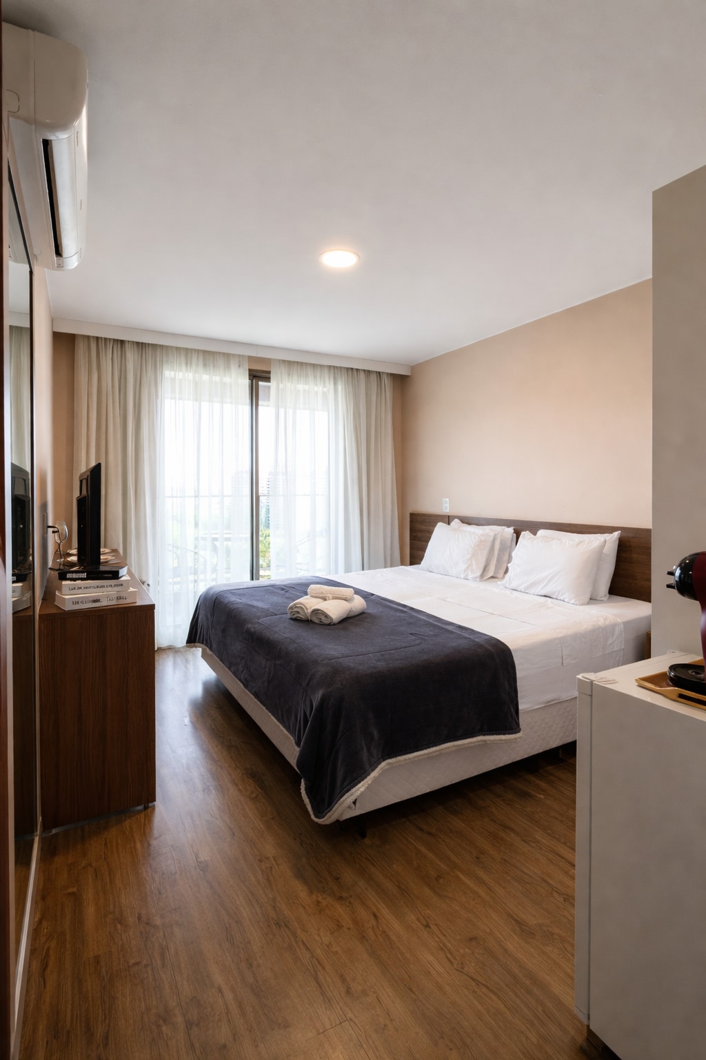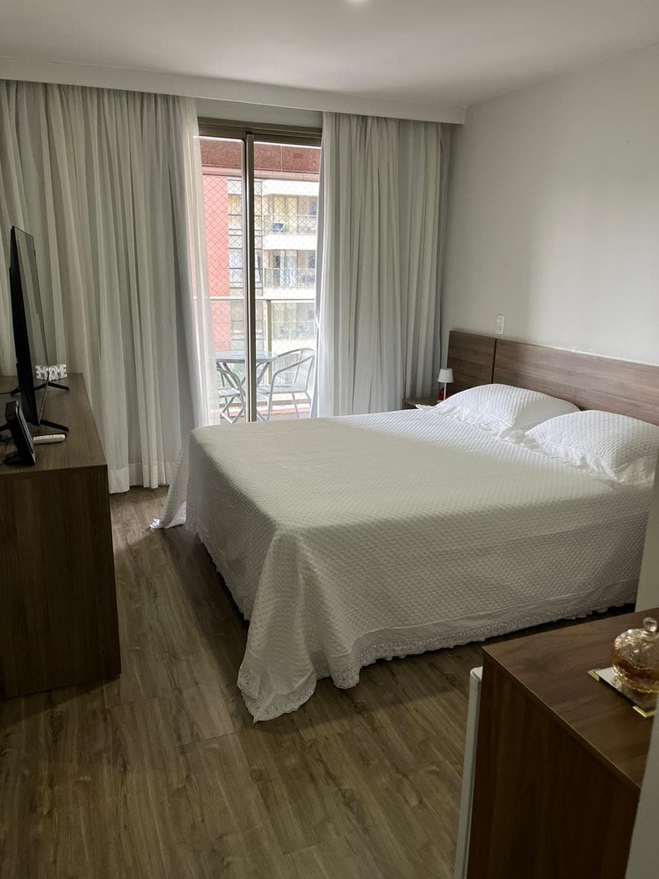 Suíte muito confortável com cama Queen, varanda com vista pra montanha com mesa e cadeiras, tv smart, frigobar, microondas, banheiro com água aquecida na torneira e chuveiro, secador de cabelo, ar condicionado, cofre e fechadura eletrônica. Estacionamento gratuito, Portaria 24 hrs, Academia 24hrs, cafeteria Ponto de ônibus na porta, 5 min do Riocentro, 10 min do Rock in Rio, Parque Olímpico e Farmasi Arena, 15 min do Shop Metropolitano, Barra da Tijuca, Recreio, Praias, Cachoeiras e muito mais