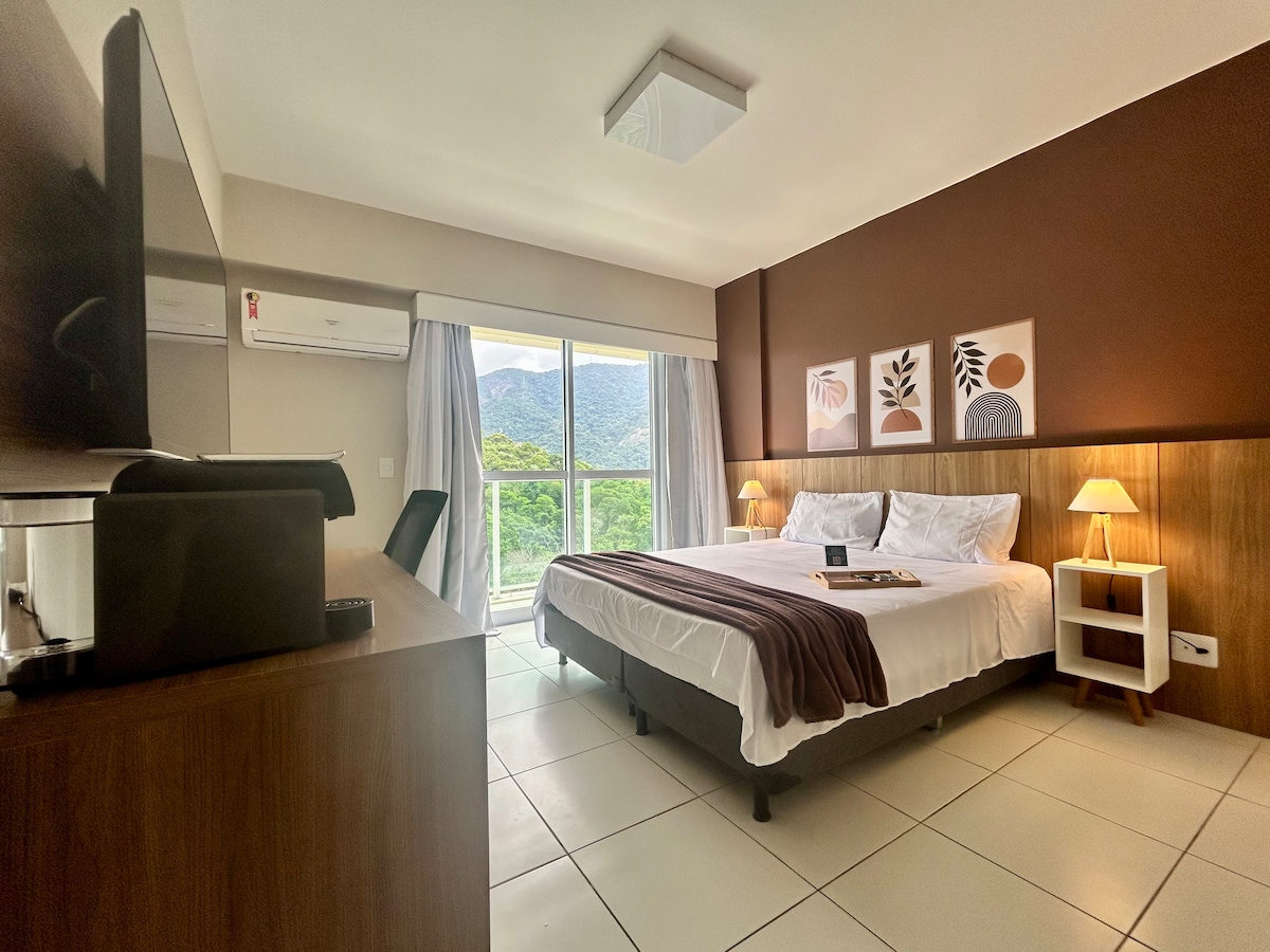 Cozy suite at the Rio Stay condominium, next to Riocentro, ideal for events, shows, and business trips. Comfortably accommodates up to 2 guests, perfect for you! In the suite: • Comfortable bed • Air conditioning • Wi-Fi • Smart TV • Mini fridge • Coffee maker • Full linens • Private bathroom • Welcome treats Condominium: • 24h front desk • Pool • Gym • Barbecue area • Jacuzzi • Restaurant • Free parking Near: • Riocentro • Olympic Park • Rock In Rio