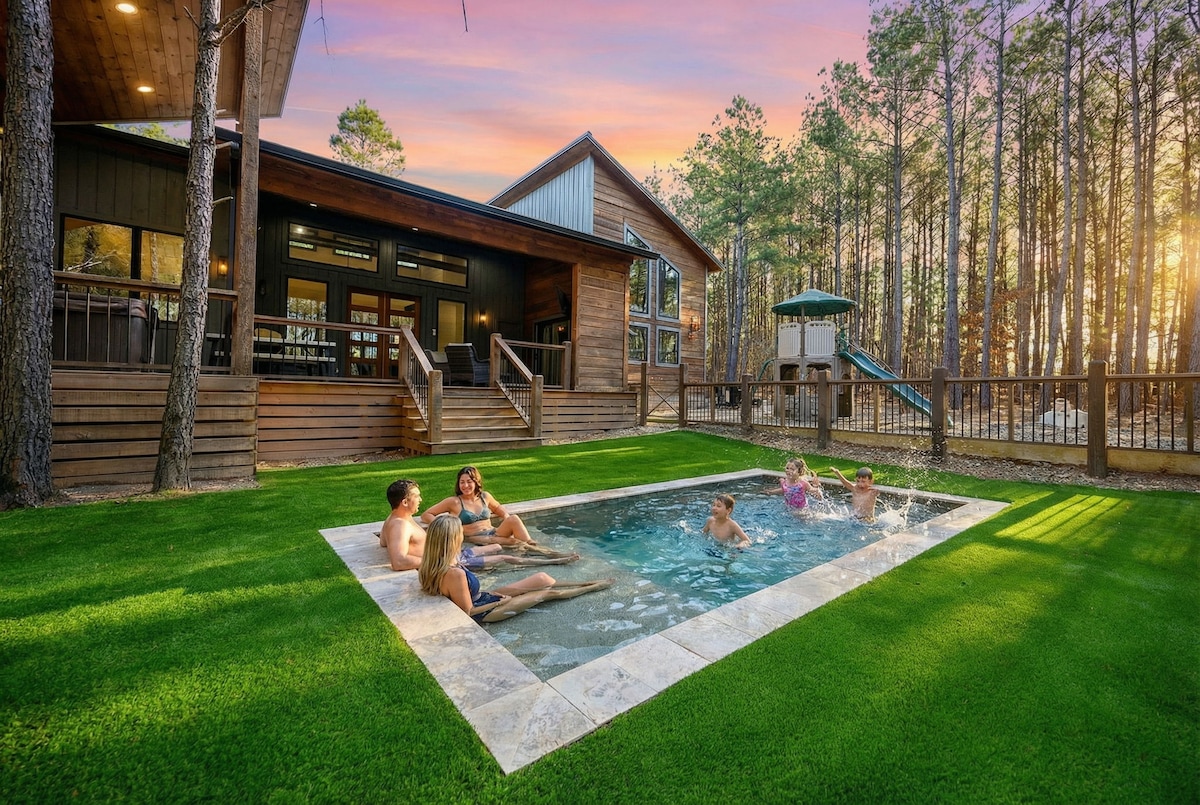 Take a trip to Hochatown, OK and enjoy a luxury cabin with family and friends! Float On is a beautiful cabin with a heated pool, hot tub, indoor and outdoor fireplaces and a fire pit. The kitchen has everything you need, including dinnerware for kids. Located in the Timbuktu Trail area and only a short drive to everything Hochatown has to offer.