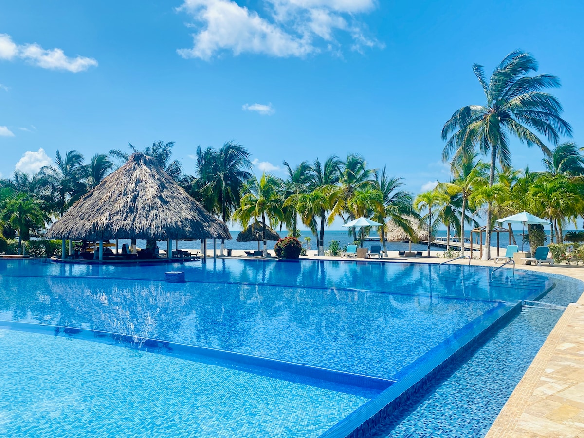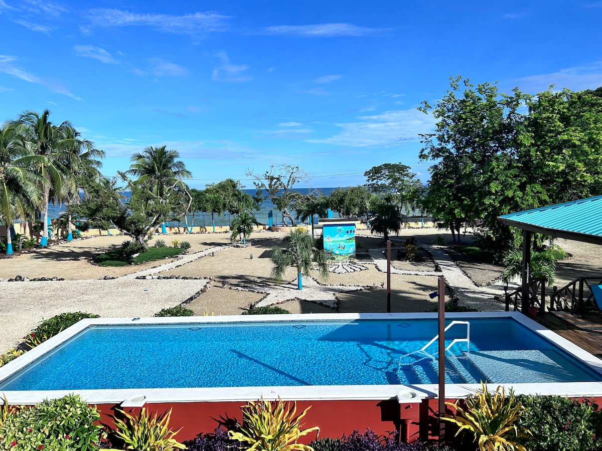 Beautiful rooftop Casita overlooking the Caribbean Sea and lush landscape and pool. It is a spacious studio with a kitchenette that is fully equipped for cooking. You can lie in bed and look out at the panoramic views while enjoying your morning cup of coffee. The ceiling and furniture is made out of beautiful Belizean hardwood. There is a luxurious big glass block and tiled shower and a Cal King memory foam bed with quality linens. Enjoy a relaxing swim in the pool and gaze out at the sea.