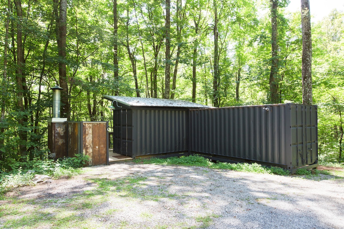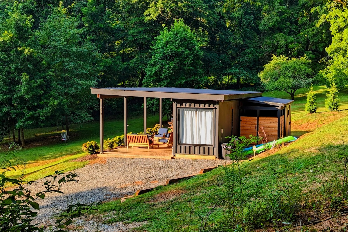 Reconnect with nature at this unforgettable escape on 3.7 acres. Our 40' shipping container is a mountain retreat 15 min from downtown Blue Ridge, GA. Take in the sunrise from the queen-sized bedroom surrounded by glass. The living room has a sleeper sofa and 55" TV. Enjoy a full size bathroom with walk out shower, and a kitchen equipped with refrigerator, stove, toaster oven, and microwave. Stream movies from the projector on the giant covered porch with forest views.