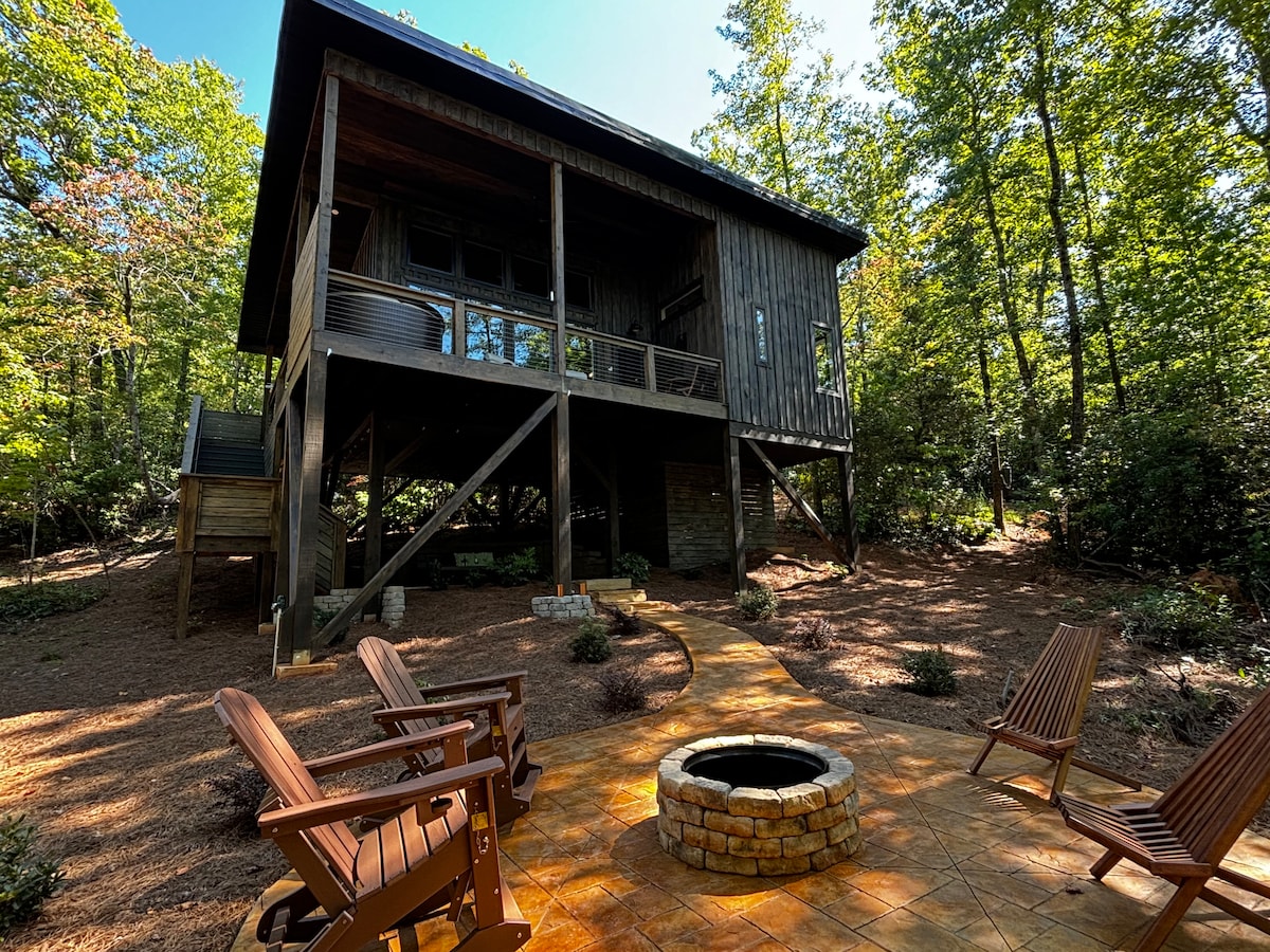 Dragonfly Treehouse: A Romantic Getaway in Dahlonega, GA Escape to the serene beauty of Dahlonega, GA, and experience the magic of The Dragonfly Treehouse—your perfect romantic retreat. Nestled among the trees, high above your own private pond. This luxurious hideaway offers everything you need for an unforgettable stay. Movie Theater, Hot Tub, Sauna, Nespresso, Soaking Tub, Luxury Shower, Heated Bathroom Floors, Towel Warmer, Put Green, Fire Pit, Outdoor Cabana Retreat w/TV and Floating Bed.
