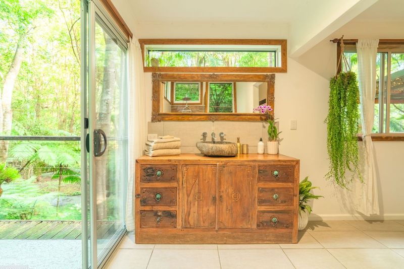 Cross the bridge and enter a magical paradise. Set amongst trees, perched in a tropical oasis is this romantic and secluded cabin overlooking the creek. Beautifully decorated interior with a Balinese feel, Complete with fully equipped kitchen, outdoor breakfast bar, wifi, Netflix, cozy wood fire for winter and cooling air conditioning for summer. Escape to this magical paradise.