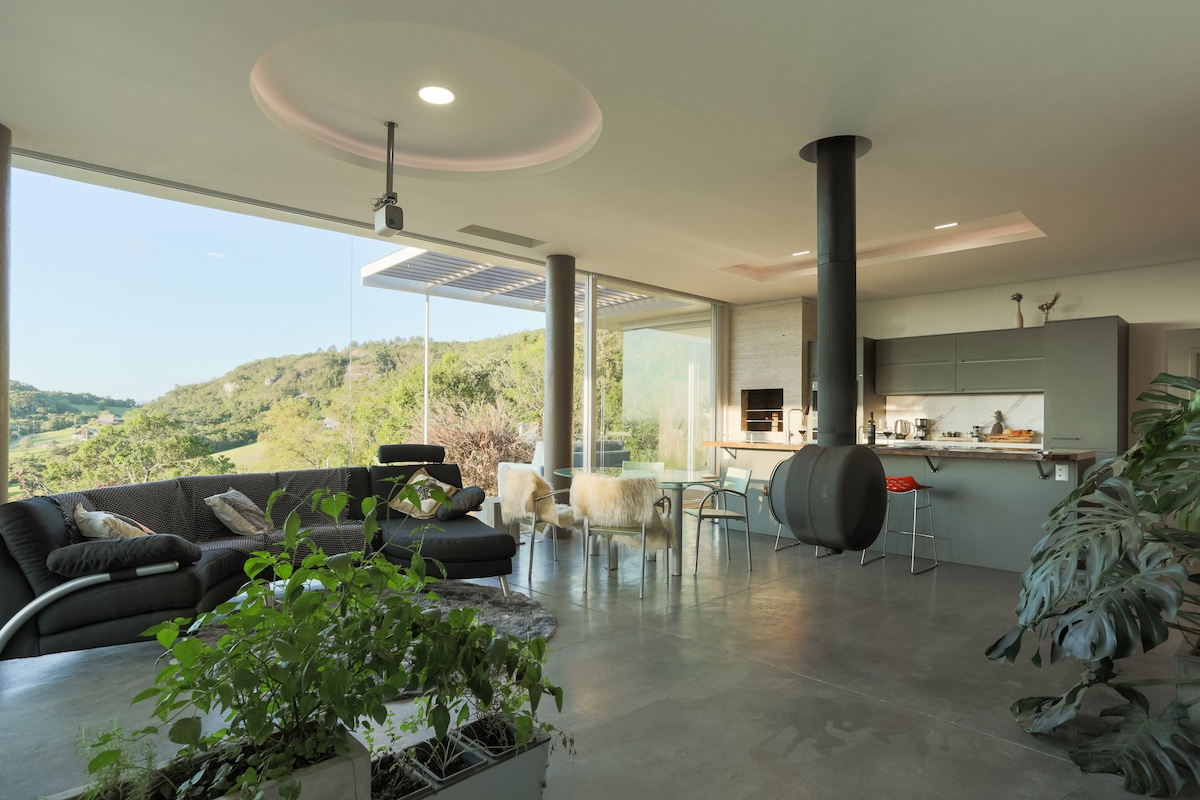 The Glass House is welcoming with modern architecture. You will find a stunning view over the valley, directly from the suite. Located in a secure, gated community with meadows, forests and lakes. High-end kitchen with isle, bean espresso machine and barbecue. Integrated living room, with modern design furniture, a suspended fireplace and 135in TV-projector. Home Office for Digital Nomads. Patio with pergola, plants and fire pit. The 2-person heated jacuzzi provides for a relaxing bath.