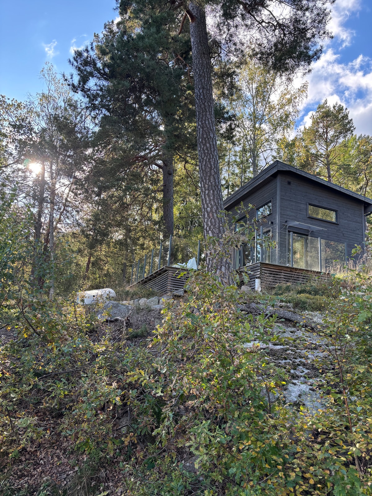 Njut av lugnet och kaffet med sjöutsikt på altanen eller bryggan några steg bort, med ett morgondopp i soluppgången i detta unika hus. - Avskilt på en naturtomt med blåbärsris och skogen runt knuten – en plats där du kan njuta av både stillhet och komfort. - Modernt, fullt utrustat kök, badrum (dusch + tvättmaskin), mysigt loft med dubbelsäng. Allt för en avkopplande vistelse – nära naturen men med hemmets alla bekvämligheter. Direktbussar till city+båt till stan och vidare ut i skärgården.