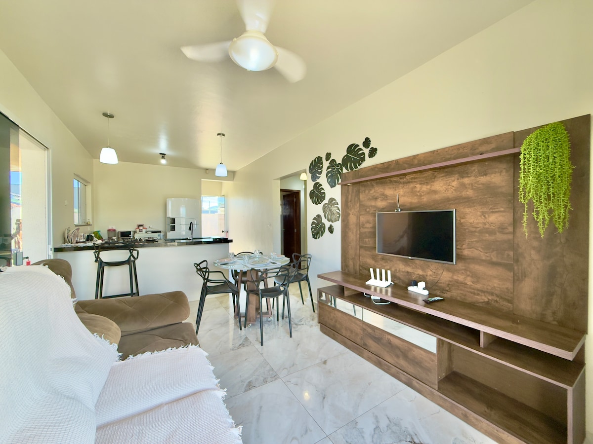 A casa possui: ar condicionado na sala e quarto. Cozinha equipada com todos os utensílios, podendo cozinhar e ao mesmo tempo contemplar o verde do quintal. Estacionamento, espaço com ombrelone, cadeiras de praia com mesa e uma ótima ducha de água doce. Ficamos à 25 km do centro histórico , com entrada pela Br e de fácil acesso. Oferecemos roupas de cama e banho completa e todas higienizadas para cada cliente. Temos lindas praias e cachoeiras que ficam à 10 de minutos de carro da propriedade.