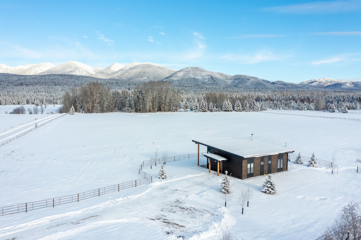 Cow Creek Cabin sits in a peaceful meadow with a gorgeous view of Big Mountain. It is just two miles to downtown Whitefish and 15 minutes to the ski hill. This tranquil Montana setting is an ideal base for adventures in Whitefish. The cabin features vast windows bringing the mountain vista inside. A wood-burning stove awaits your return from a day on the slopes or trails. The kitchen is stocked with everything you need to cook your own meals. The OLED TV is connected to fast Starlink internet.