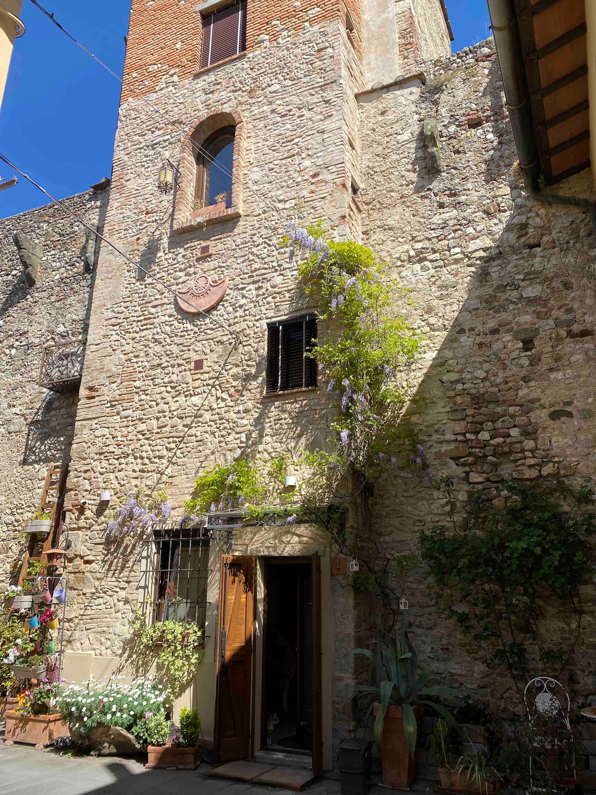 The tower and the private garden with sun loungers, barbecue, pergola with table and chairs, reserved parking space. The pool is shared with the other guests of Borgo Sanguineto.