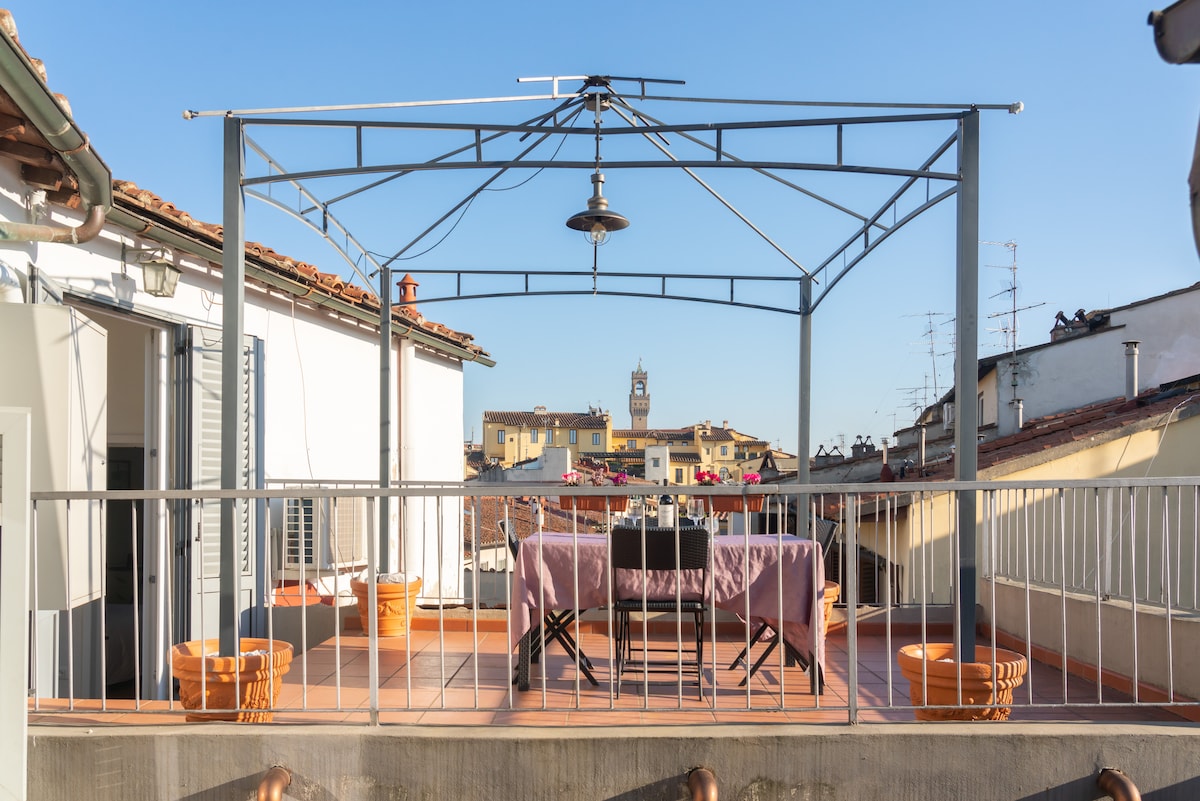 The truly Florentine soul of this exquisite apartment and its panoramic terrace sets the stage for an unforgettable stay. From this privileged vantage point above the rooftops, you can almost touch Florence’s monuments as you sip a sunset aperitivo, or greet the morning beneath the pergola with a leisurely breakfast while the city awakens in golden light.