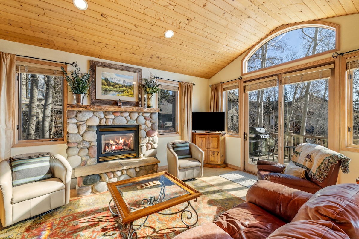 Nestled in an Aspen grove off of an alley, this location is very private from the outside world. It offers an open living, kitchen, dining areas with a 24'X16' deck on the second floor. Complete with two master bedrooms and baths on the first floor and a covered patio, this vacation just perfect for up to five guests. A covered carport and walkway always keeps you dry from snow or rain. You are just a block away from a lease-free dog park and a 10 minute walk from downtown. You'll love it!