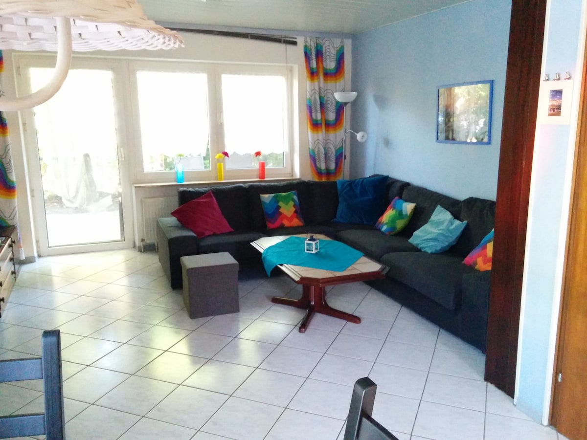 Die Ferienwohnung im Mittelbau des Hauses bietet mit ca.90qm Fläche genügend Platz für 4-5 Personen.Ein gemütlicher und großzügiger Wohn-Ess-Bereich mit Kaminofen lädt zum Entspannen und Verweilen ein. Im oberen Stock befinden sich zwei Schlafzimmer. Die Wohnung verfügt außerdem über ein modernes Badezimmer mit Dusche. Die Terrasse mit Blick in den Garten bietet die Möglichkeit für ein Sonnenbad. Am Abend können Sie hier einen traumhaft schönen Sonnenuntergang erleben. WLAN sowie PKW-Stellplatz.
