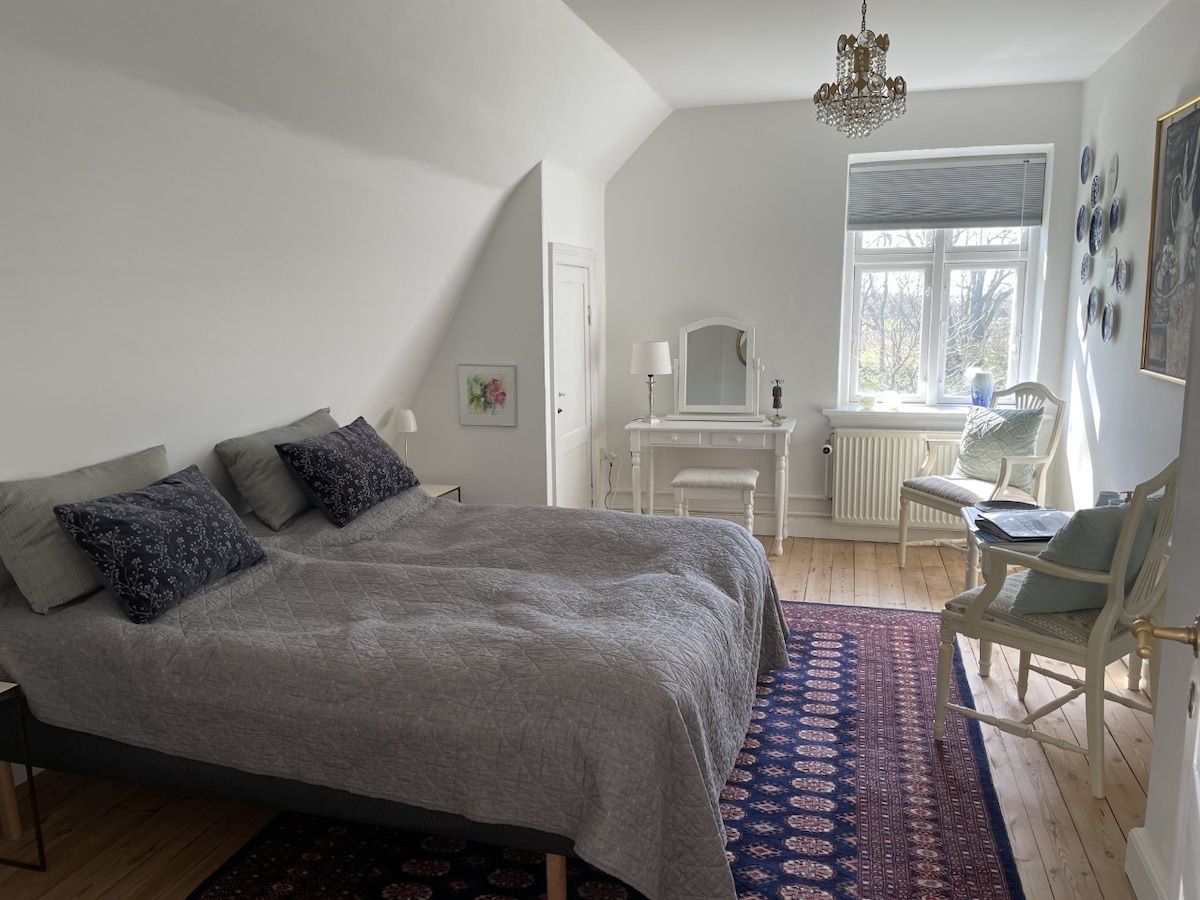 Welcome to the top floor of our charming yellow wood house! Welcome to Anettes Bed & Breakfast. :-) The green room has a king size double bed that can be pulled apart to 2 single rooms. The room is decorated with whimsical details and flowery wallpaper and nice comfy beds. The room faces the red wood house on the west side of the house, where you can enjoy the evening sun. My B&B has 2 rooms, so you may meet travellers from the other room.