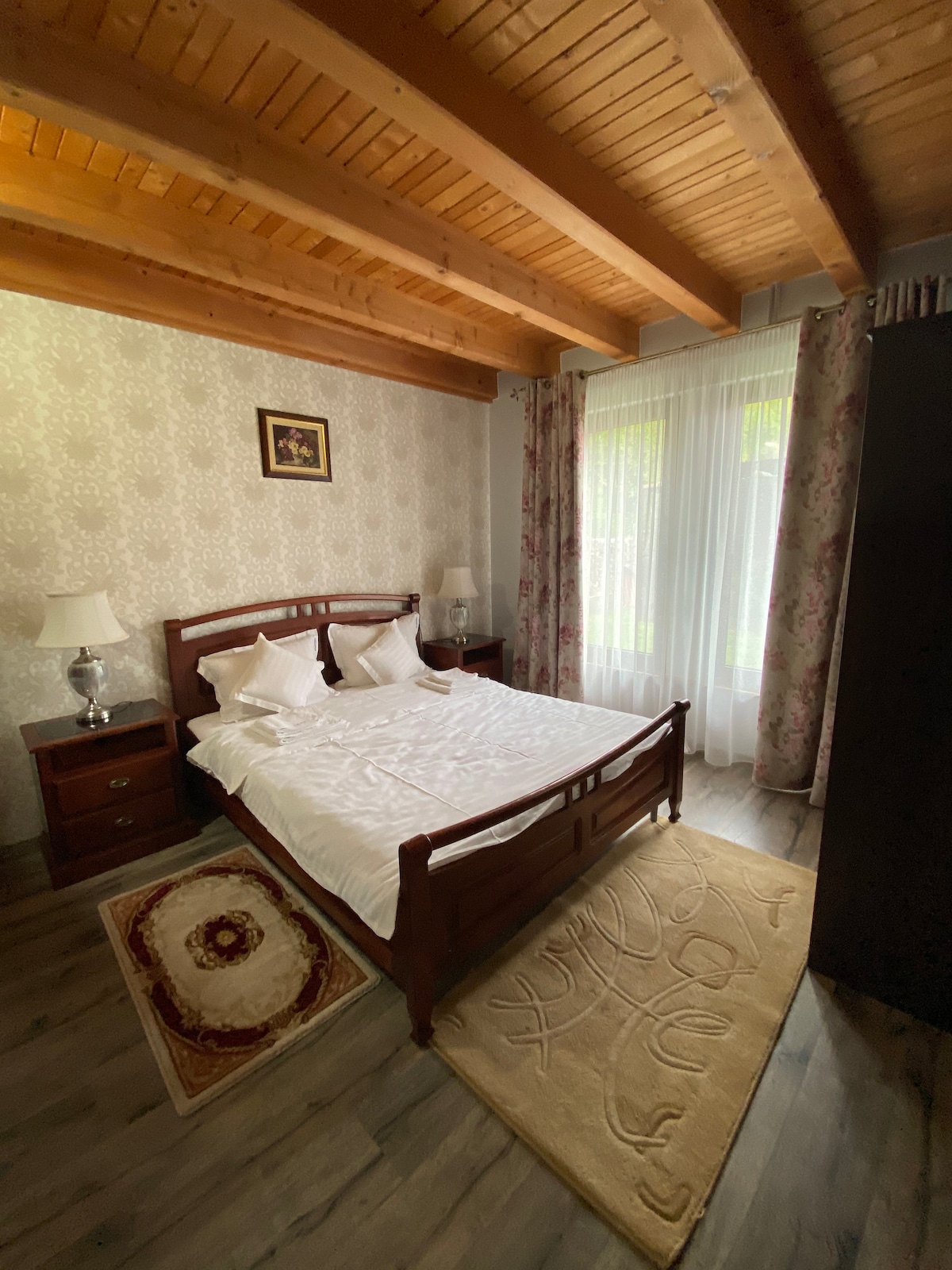 Casa cuprinde la parter un living spațios, un dormitor cu baie proprie, o bucătărie utilată, toaletă, o terasa exterioară cu grătar și spațiu de luat masa, ciubăr cu apă încălzită si hidromasaj( ciubărul contracost 300 lei/ o zi sau 400 lei mai multe zile) La etaj sunt 3 camere cu paturi duble și baie proprie fiecare, în 2 dintre dormitoare sunt paturi suplimentare de o persoana și o saltea la etajul uneia dintre camere.