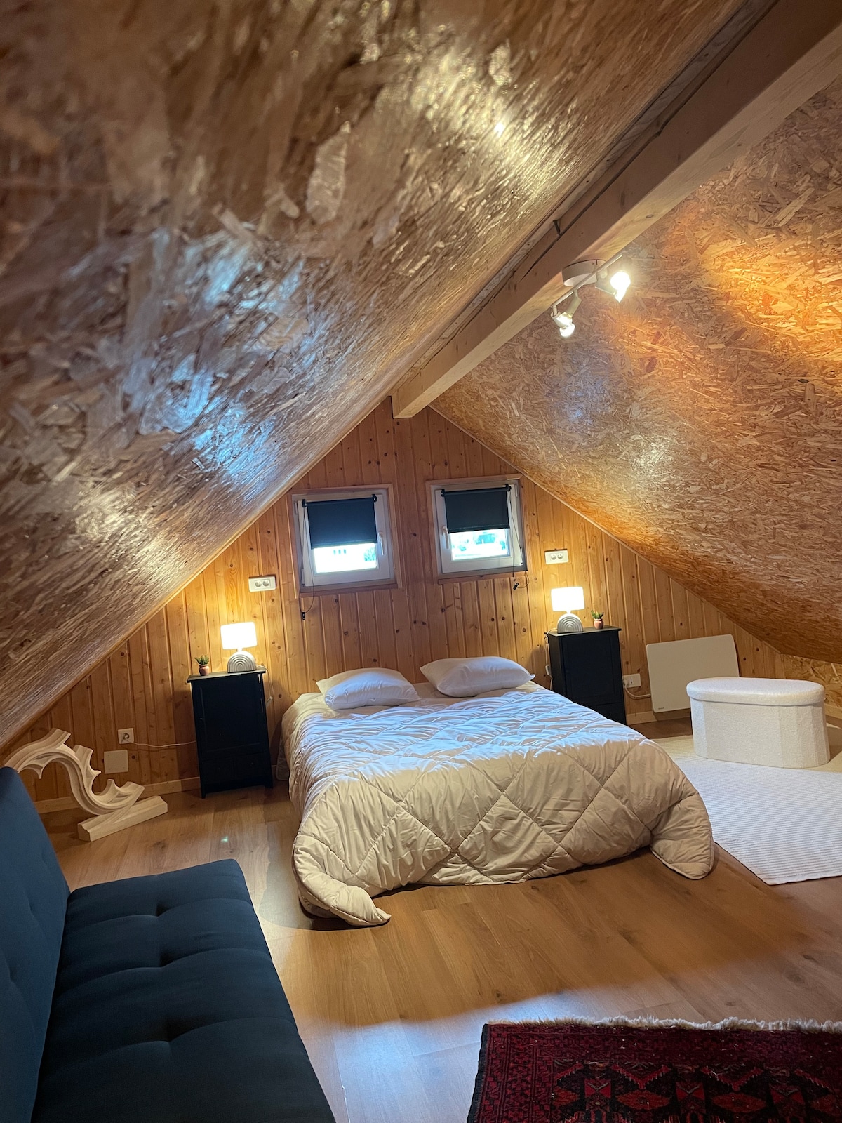 Sous le toit, espace spacieux, lumineux, calme et indépendant au deuxième étage d'une maison de caractère. Deux grands Vélux vous offrent une vue imprenable sur les Vosges. La location comprend la pièce principale, une chambre attenante avec un lit double, une salle de bain, une petite cuisine et une mezzanine avec 2 matelas posés sur des tatamis. La restauration a été réalisée avec des matériaux écologiques... et avec beaucoup de soin et d'amour! Vous avez accès au jardin à votre guise!