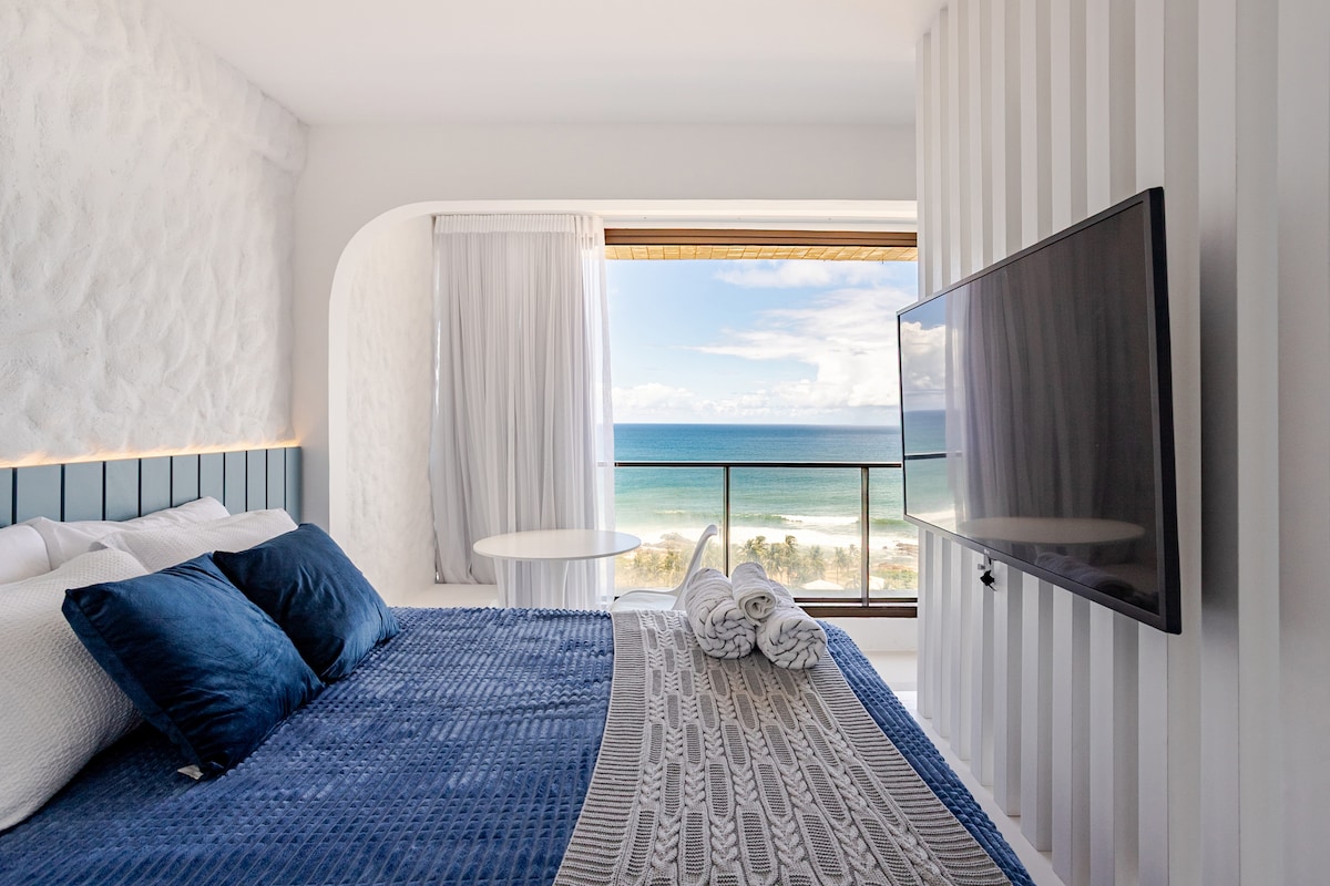 Studio com vista lindíssima para o mar com: piscina e academia no rooftop, quarto sala e varanda, wi-fi e estacionamento rotativo. Acesso fácil e rápido a praia. Ideal para 2 pessoas Fornecemos: Roupas de cama e toalhas de banho Áreas comuns do prédio: Academia Coworking Bicicletário Lavanderia Algumas distâncias: 7,5km Aeroporto 250m Praia Pedra do Sal 1,3km Hipermercado 28km Pelourinho Panelas e talheres 30km Igreja do Bomfim Cozinha temos: Microondas Cafeteira Liquidificador Air fryer