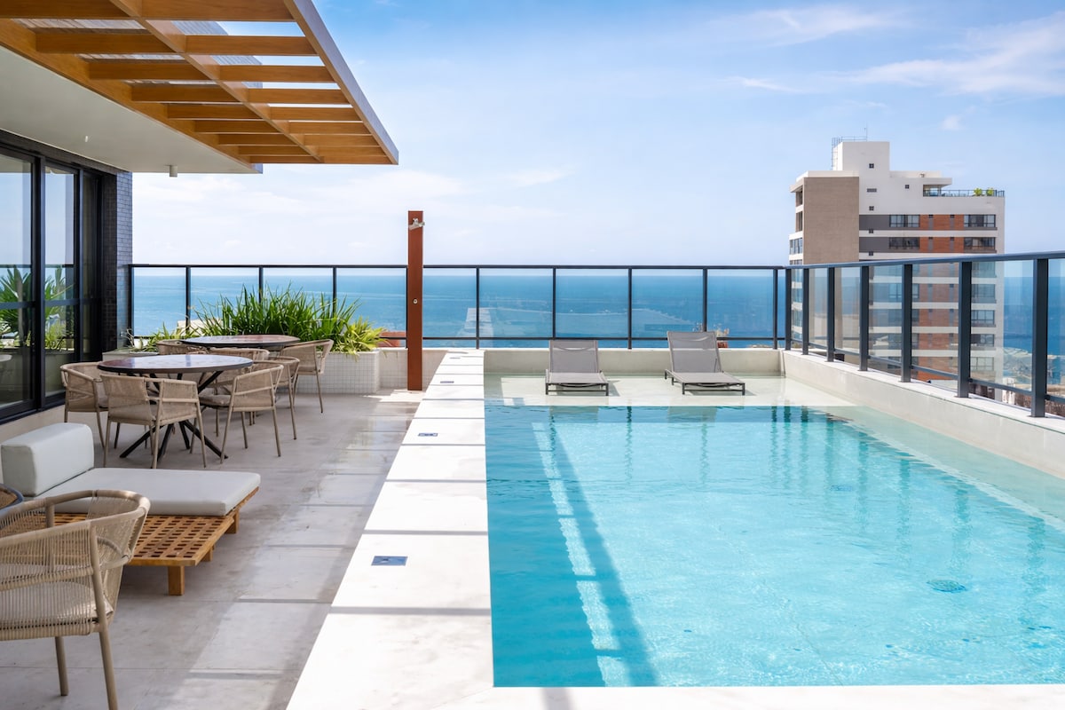 Hospede-se nesse espaço moderno e aconchegante com todo o conforto que vc merece à 200m do circuito do carnaval. Varanda com vista fascinante. Academia, Rooftop gourmet com Piscina vista Mar deslumbrante, Chuveiro, Espreguiçadeiras, Mesas e cadeiras . Tudo isso na melhor localização possível, a minutos caminhando até a praia, Farol, Cristo e Porto da Barra, Restaurantes, Bares, Delicatessen, mercados, Farmácias, Shopping e tudo o mais que possa vir a precisar pra uma estádia Inesquecível.