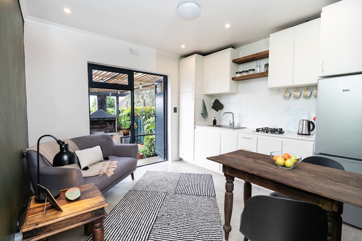 Relax in this stylish, modern, solar-powered loft in Mostertsdrift, Stellenbosch's prime neighbourhood. The open-plan kitchen, cozy living area, and private balcony with stunning mountain views to enjoy your morning coffee or a glass of wine, is perfect for up to three guests. Just a short walk from Lanzerac Wine Estate and close to cafes, shops, and dining spots. Enjoy scenic hikes or mountain biking in Jonkershoek Nature Reserve, wine tasting, or simply unwind—everything is at your doorstep!