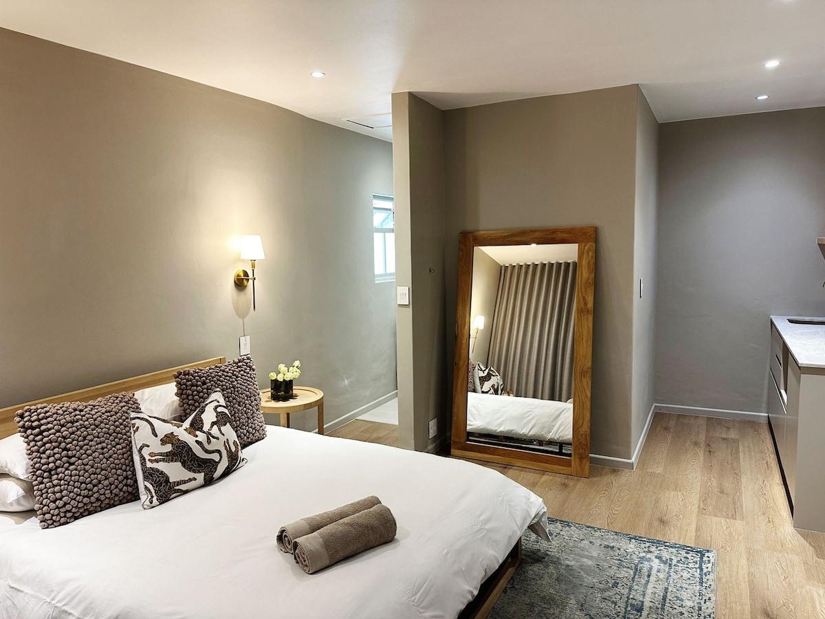 Relax in this stylish, modern, solar-powered loft in Mostertsdrift, Stellenbosch's prime neighbourhood. The open-plan kitchen, cozy living area, and private balcony with stunning mountain views to enjoy your morning coffee or a glass of wine, is perfect for up to three guests. Just a short walk from Lanzerac Wine Estate and close to cafes, shops, and dining spots. Enjoy scenic hikes or mountain biking in Jonkershoek Nature Reserve, wine tasting, or simply unwind—everything is at your doorstep!