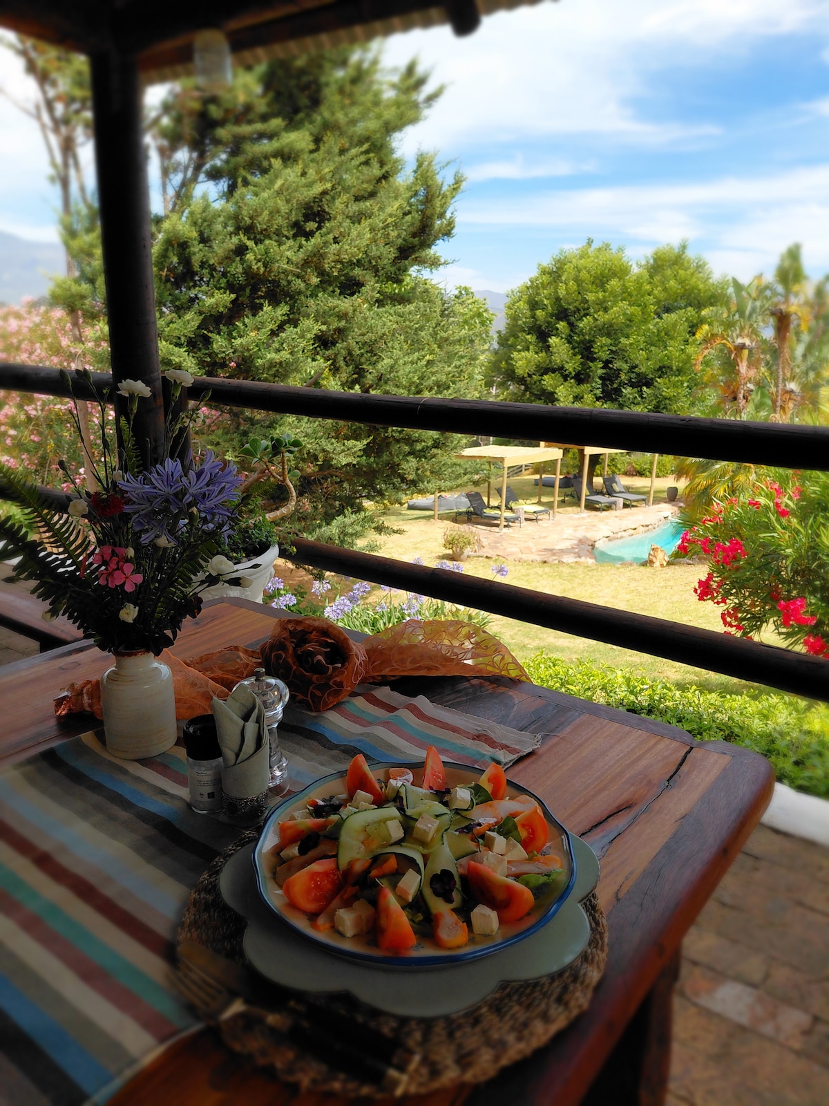 Tugela blends a collection of Botanical, wildlife and bird prints, bamboo and open-beam ceilings, woven African baskets, grass-lamp chandeliers, colourful Indian cotton bedspreads and cushions, with bright walls and textured wall paper to give this home a wonderfully relaxed, yet sophisticated, feel. Large garden with swimming pool and expansive views of the surrounding mountains. Secluded and serene. A family sanctuary in the heart of Franschhoek.