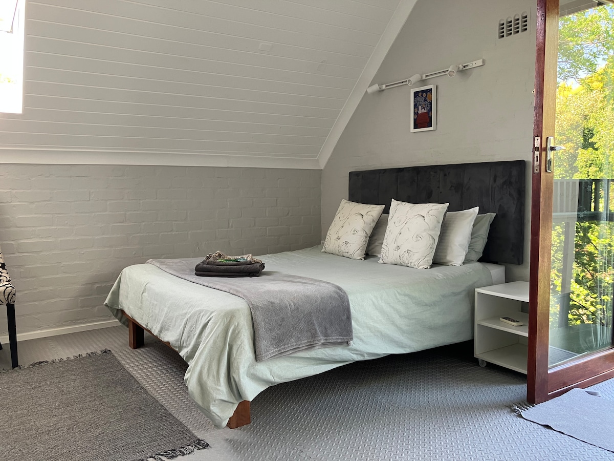A tranquil indoor-outdoor living space ideal for couples or business travelers. The stylish studio opens up onto a large patio with braai. Enjoy our long summers outdoors! The studio has a separate entrance from the main house. Queen bed with open walk-in shower & separate toilette . It has fiber WI-FI, full DSTV, a tiny kitchenette with tea/coffee facilities, toaster, microwave, fridge & single induction plate. Secure onsite parking. We have 2 Small dogs for added security.