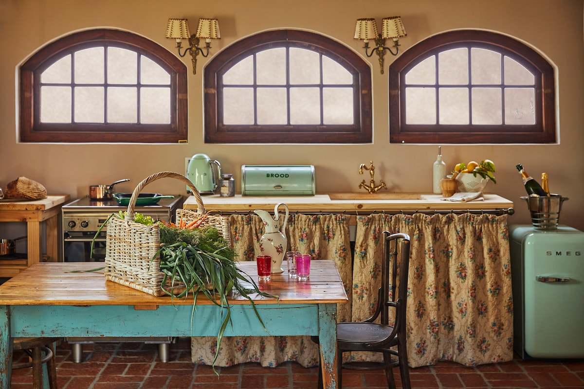 Feminine and layered and full of art, like Ouma Celia was, our Viviene Leigh of the Vaal rivier. A homage in pink and pistachio. The two cottages are located just below Die Boekklub and overlook the Drakenstein Mountains. The cottages share a wrap around veranda and small private garden.