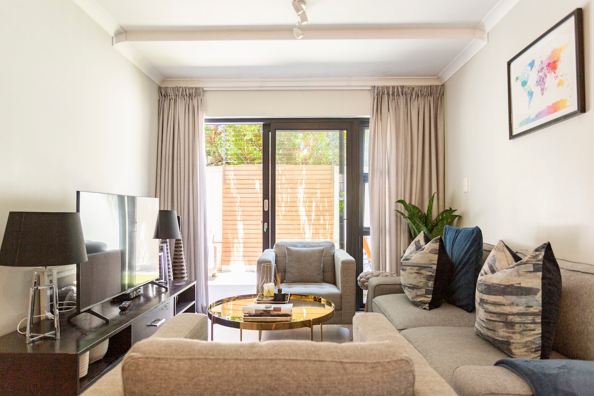Nestled amidst the picturesque vineyards and rolling hills of the Winelands, this luxury apartment embodies the essence of sophistication, comfort, and a seamless blend of nature and modern living. First‑floor apartment with fully equipped kitchen and open-plan living. Both bedrooms ensuite, each with a walk-in shower. Sleeps 4 |66m²
