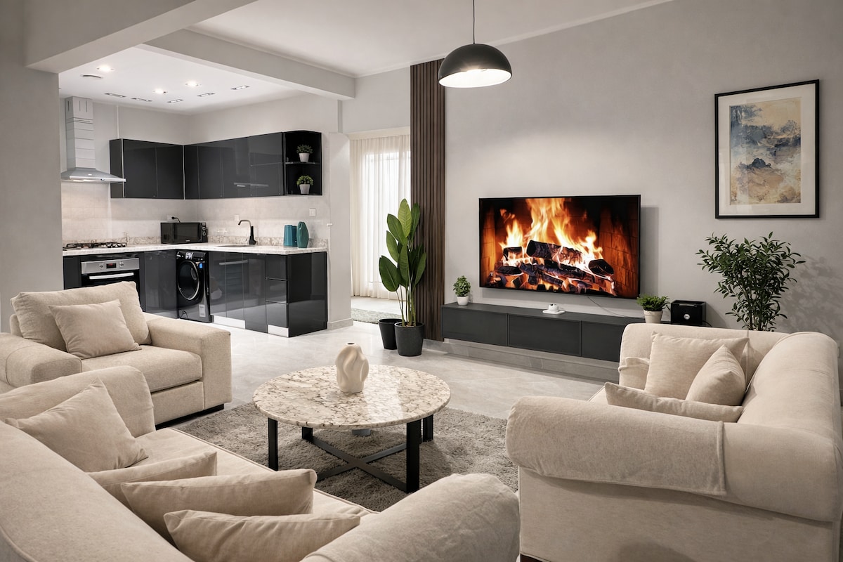 Discover our 1-bedroom gem in Golden Gates Compound—5 mins to Maadi, 10 mins to New Cairo and Nasr City, 15 mins from Cairo Airport and Heliopolis. Fully equipped American kitchen, a stylish mix of modern and boho vibes. Enjoy a garden view, 24/7 security, and on-site amenities like coffee shops, restaurants, Carrefour Hyper Market, and even a hospital. Unwind with a 65-inch smart TV, complete with streaming services, and stay connected with fast Wi-Fi. Your Cairo adventure begins here!