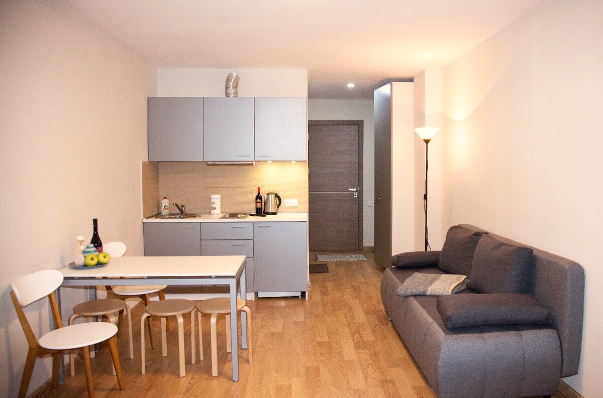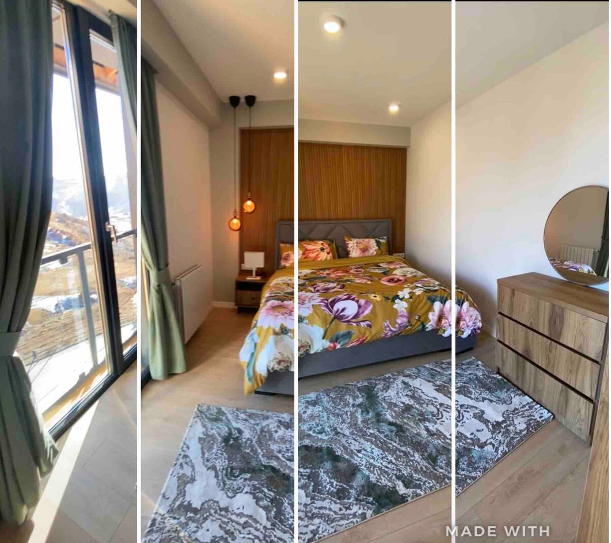 Dear guests, if you'd like to stay in a cozy luxury apartment with astonishing mountain views and a 1-minute walking distance to the ski loft, mini-market, and restaurants, this is the best place for you to stay. The apartment is fully equipped with everything you might need for your stay. Apartment features include a Wi-Fi, smart TV, queen-size bed, folding sofa, full kitchenette, bath with a hairdryer, and more. As a bonus, there is a ski rink right in front of the apartment. why wait? Book