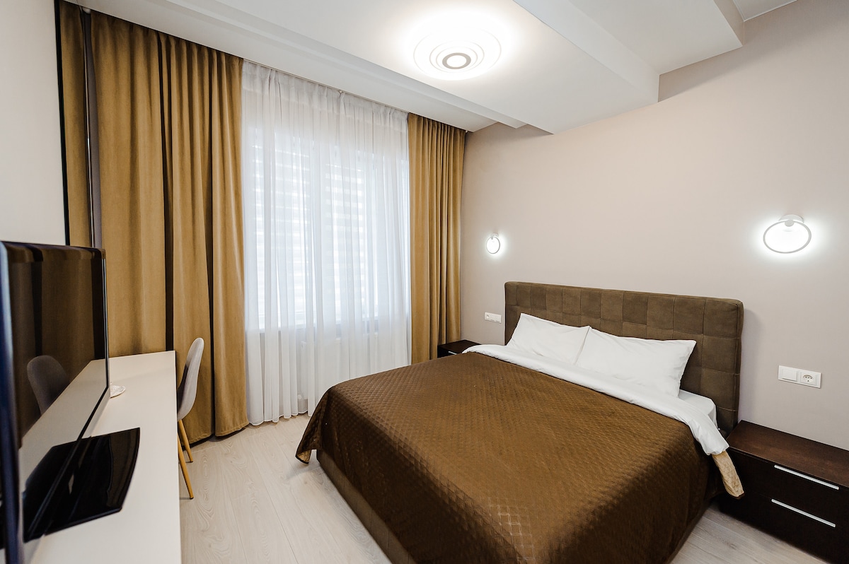 This apartment is the ideal base for your stay in Chișinău, offering a space that’s both comfortable and inviting. With a fresh, modern design, each room is crafted to help you feel at home, whether you're here for a weekend getaway, a family trip, or business. The layout is flexible, making it easy to relax or get things done, and just steps away from the best the city has to offer. Whether you're unwinding or exploring, you’ll have everything you need for an effortless stay.