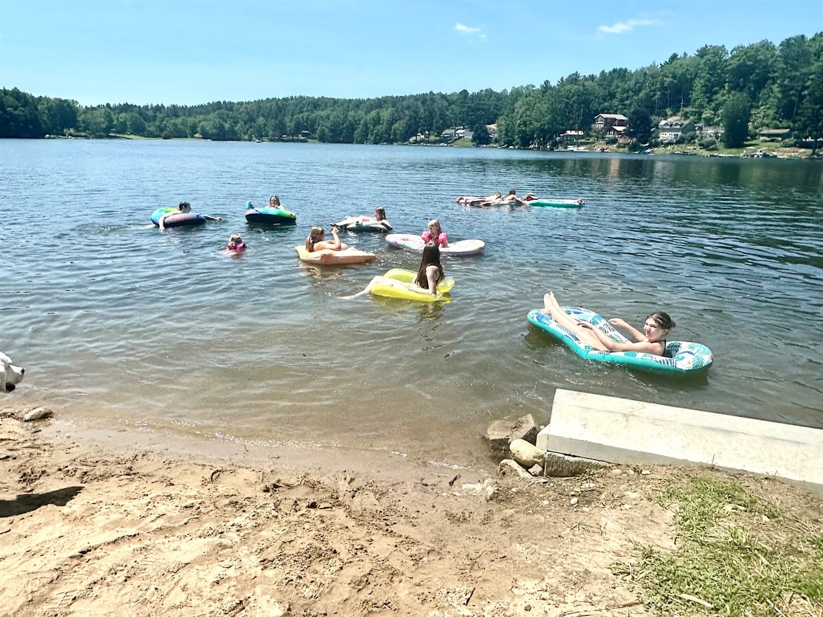 Secluded getaway for a stay/work-cation. Travel & stay as a group or separate! Winterized house has 4 br, 2 kitchs , 2 living rms & 2 baths. 2nd floor closes off for two separate living areas w/ 2 br each, or keep it open as a 4 br house. Cozy sunroom- enjoy the sunrise. Huge deck & fireplace at house, or enjoy a fire on the private 80ft lakefront across the street & down stairs. Boat whips on dock. Kayaks, SUPs & canoe for use! Docks/deck to spread out.