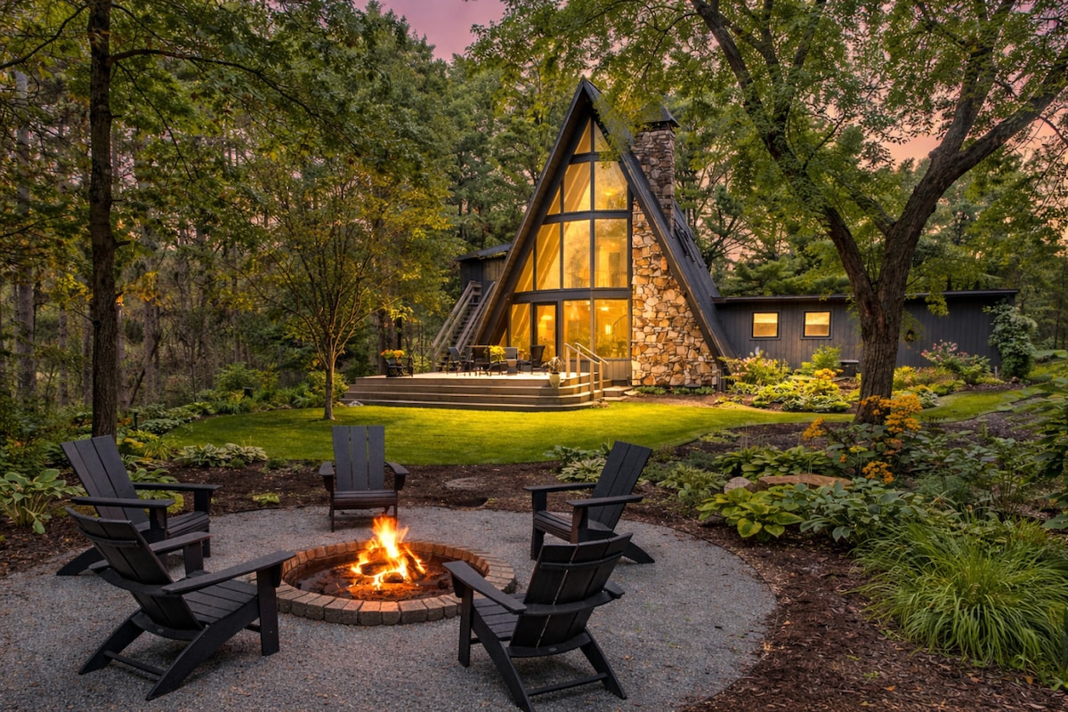 Hot tub under the stars, a soaring A-frame w/ fireplace and wall of windows, plus a private theater built for unforgettable stays. ✔ Private hot tub in the trees ✔ Soaring A-frame w/ fireplace + wall of windows ✔ Private theater w/ surround sound + PS5 ✔ Game zone w/ air hockey + foosball ✔ Minutes to Stevens Point, trails, breweries & Granite Peak