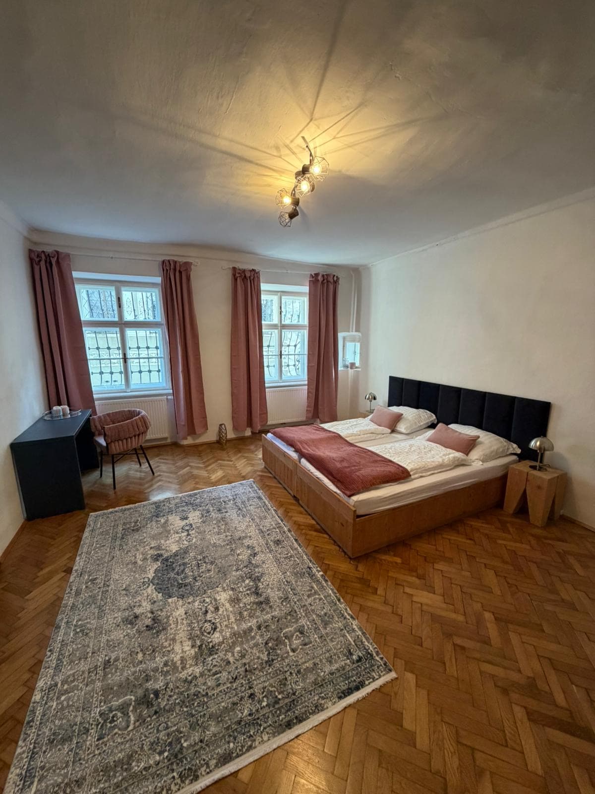 The 100 m² apartment is located on the first floor of an old, newly renovated city villa. The apartment has a special flair thanks to the 3.5 meter high walls and the light-flooded rooms. If you want to relax, this is the right place for you. The historic town square of Steyr with boutiques and restaurants, as well as the local recreation area on the river are only a 5 to 10 minute walk away. There are 3 sleeping accommodations in 3 different rooms. High speed internet (200 Mbps) is available