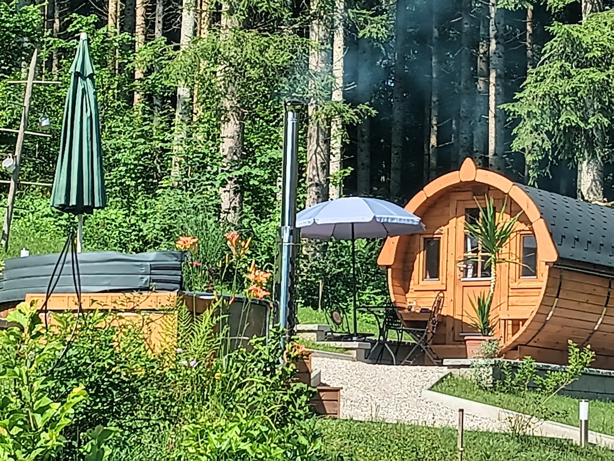 Du wirst deine Zeit in dieser romantischen Unterkunft nicht so schnell vergessen. Inmitten der Natur stehen unsere "Heidi" und "Elfi". Ob gemütlich im 180cm Bett liegen und aus dem Fenster schauen oder auf der eigenen kleinen Terrasse den lauen Abend genießen....ganz wie es beliebt😉....auch ein Whirlpool steht bereit. Jedes unserer Fässer hat sein eigenes Bad😉