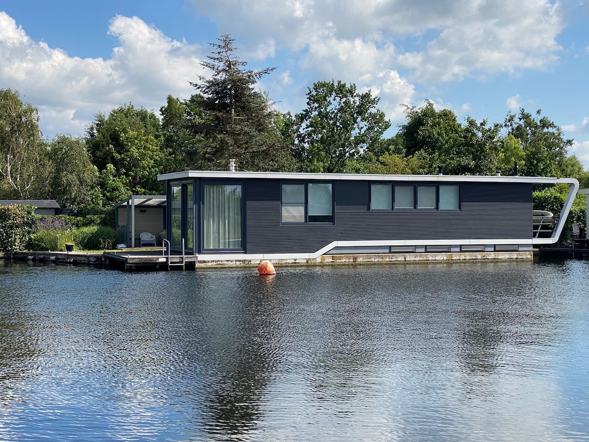 Stay in your own house boat on the lake! Enter the swimming water directly from the landing stage. (natural water) Rent a boat or bike to see the lake area and tranquil surroundings. Spacious living area with a sofa bed for 2. Bathroom with bath and separate shower. Bedroom with double bed and love seat overlooking the water. Your front door opens to a private garden. Private entrance and free reserved parking. Only 15 -20 minutes from Amsterdam city centre by car.