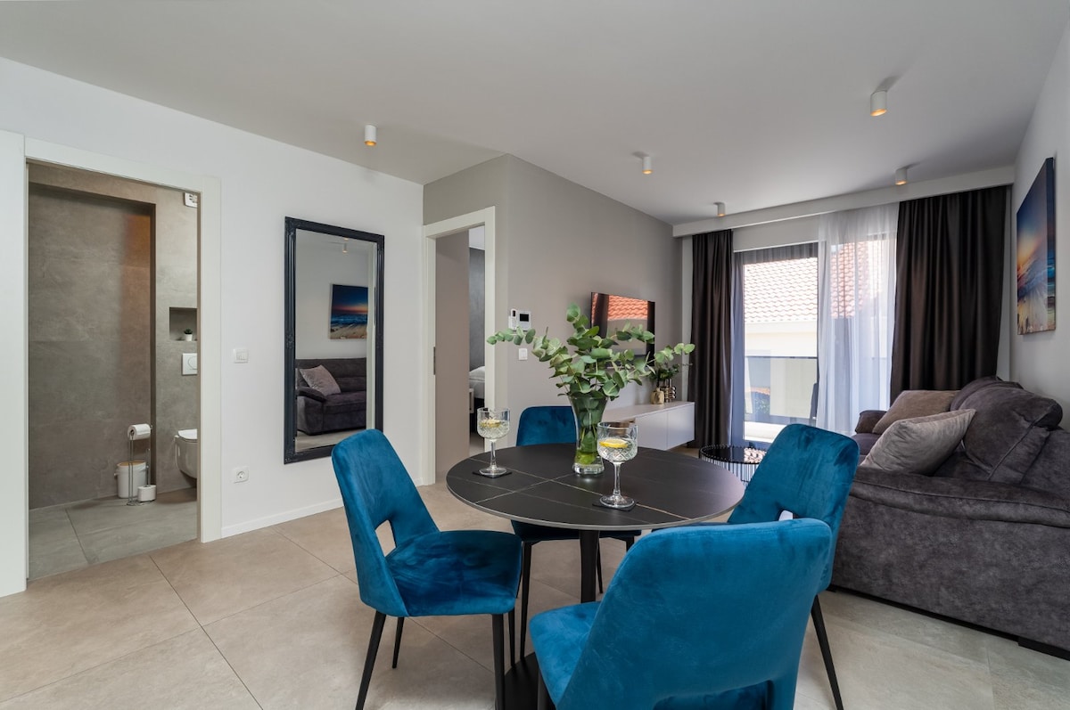 apartman od 120m2 u novoj modernoj zgradi izrađenoj 2022 godine,za 5 osoba od čega je 50m2 privatnog vrta kojemu pripada privatna masažna kada sa nevjerojatnim pogledom na more otoke i zalaske sunca.podzemna garaža free. udaljenost do starog grada je 2.5km! vlastitim autom ili taxi-uberom(6-7 € za 4-5 osoba)5-6 min trajanje vožnje. bus stanica je udaljena 4min pješice,2.5€ po osobi bus , vožnja 8 min. u blizini apartmana imate supermarket, restorane,trgovine,barove brodska luka 7 min pješice