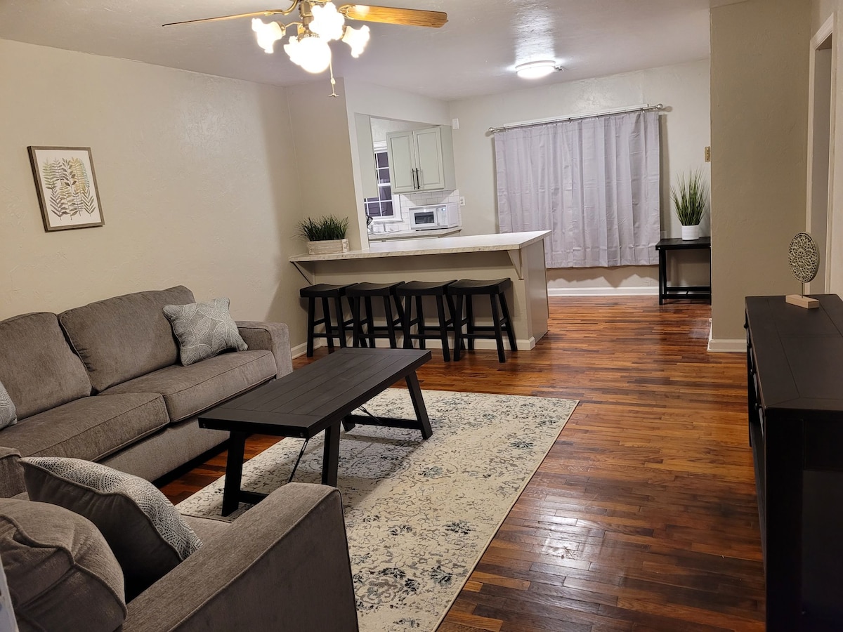 Be close to everything - conveniently located 1 block off main street - making it easy to plan your visit. Our smart enabled home features an open floor plan from the dining nook and coffee bar with a Kuerig, through the gally kitchen to the living room featuring roku tvs and comfy queen beds in each room , wifi, washer/dryer, privacy fenced area with gill and fire pit - the Roadrunner is fully eqipped with all the amenities of home for your stay. Private feel in a centrally located home.