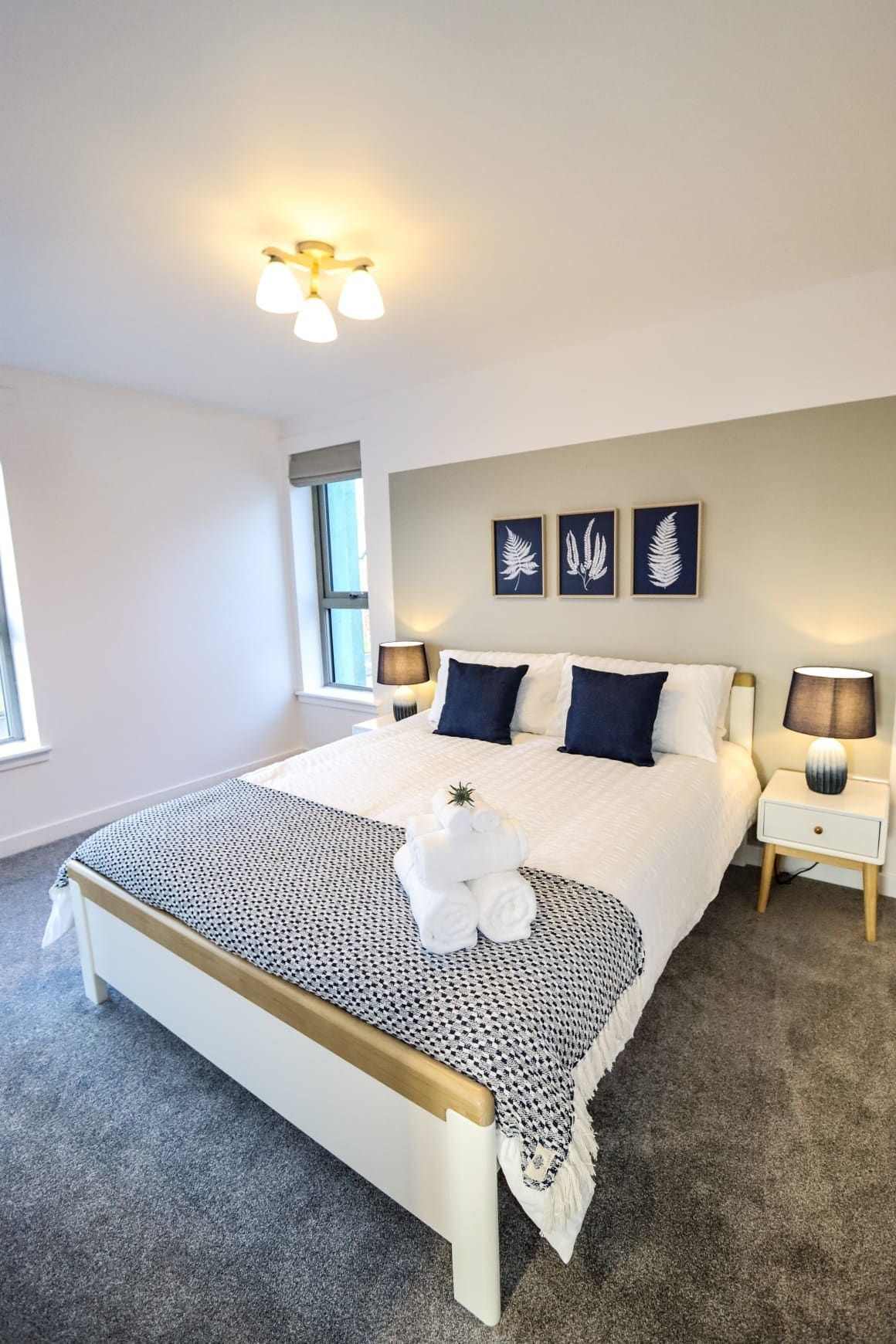 Stay in this modern 2-bed ground-floor apartment in Stirling’s Riverside area, a quieter residential spot within easy walking distance of the city centre. Enjoy a modern living room with dining for four, a fully equipped kitchen, king & double bedrooms with fresh linens, and a sleek walk-in shower. Free on-street parking outside, Smart TV & fast Wi-Fi make it ideal for families, couples or business stays, with scenic riverside walks and views of Stirling Castle & the Wallace Monument close by.